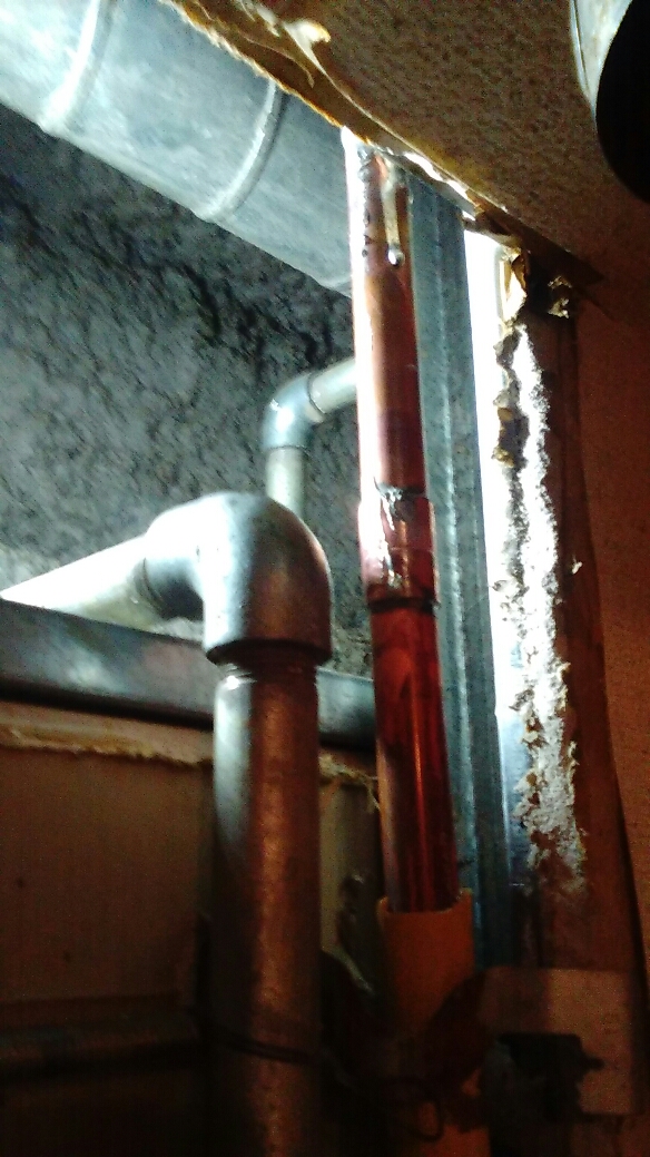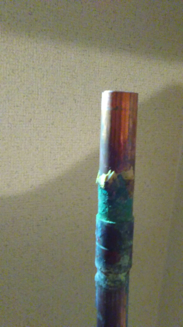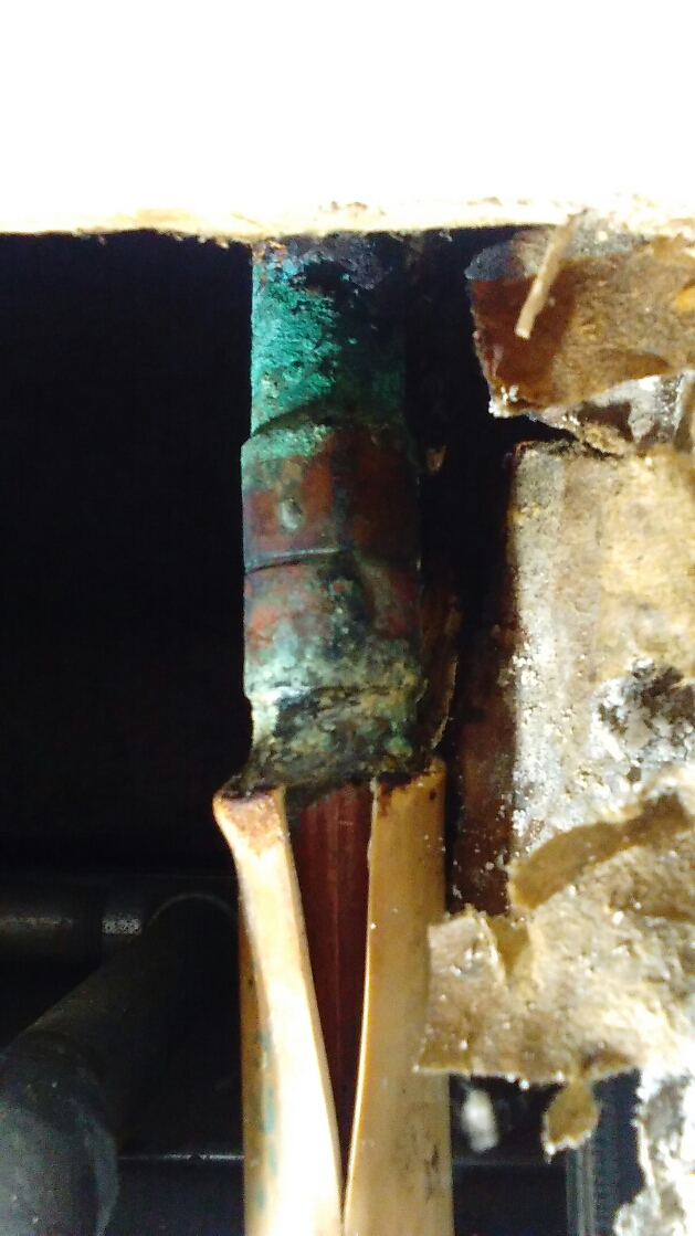 水が漏れています。給湯器を外してボードを外すと銅管の繋ぎ目が腐食して水が漏れています。あともう一か所ピンホールと言って銅管はイオンの関係で穴が開く事があります。そこから糸みたいにピー