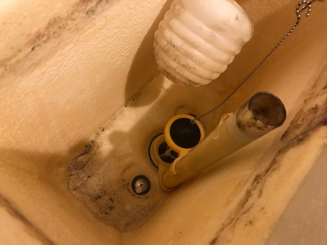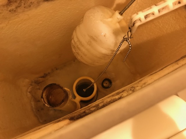 到着してタンクの中を調査すると、レバーを引いて浮くゴム玉がひっかkトイレの水が止まらなくなったとのことでアパートにお伺いしました。