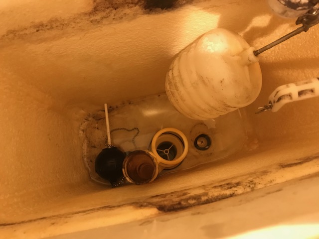 到着してタンクの中を調査すると、レバーを引いて浮くゴム玉が劣化して粘着しており、収まりが悪くなっていました。