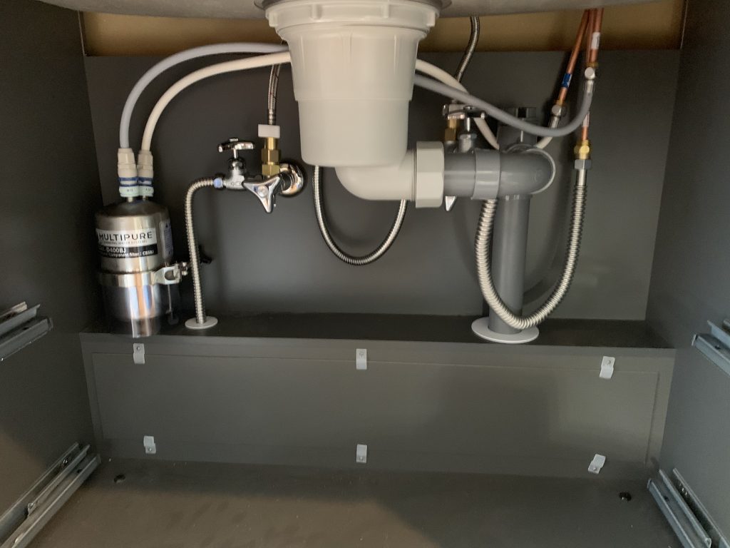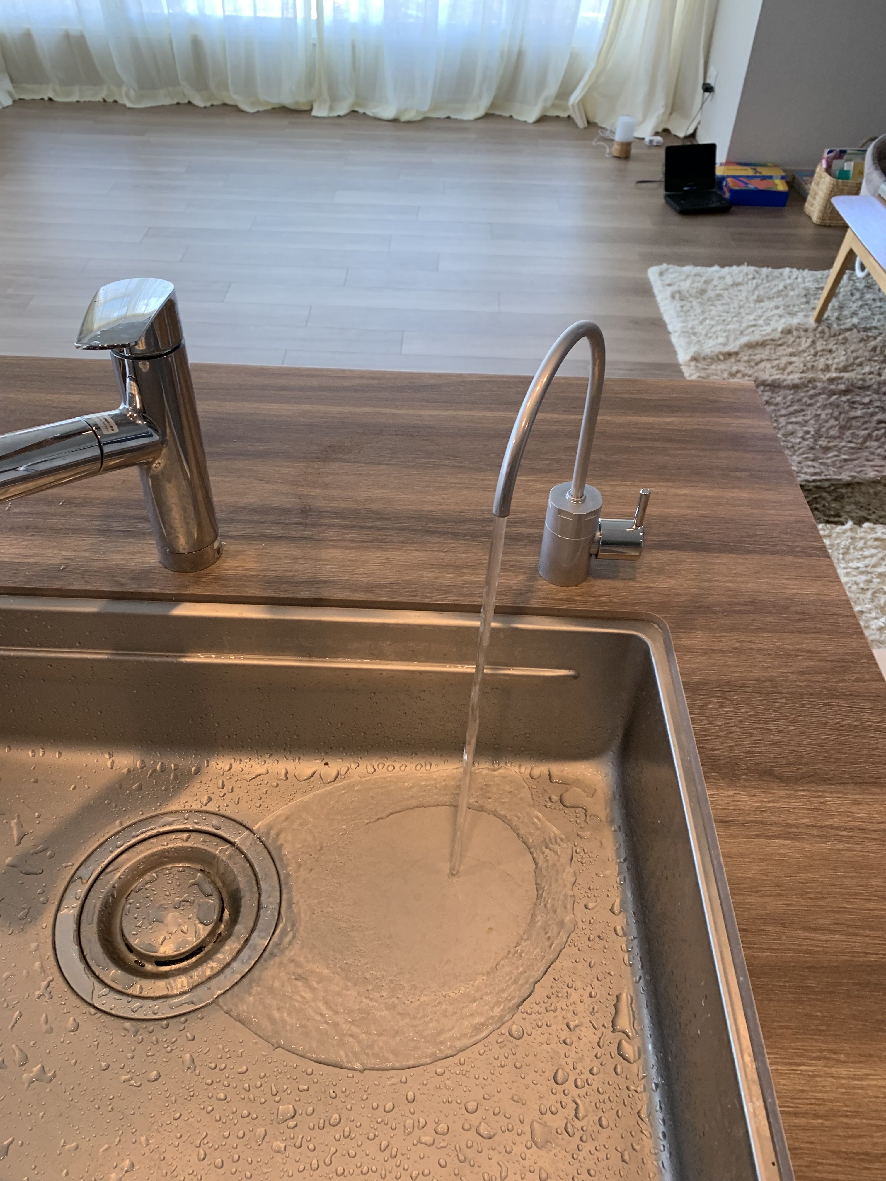 本日はビルトイン浄水器の新規取付依頼がありお伺いしました。浄水器本体や蛇口等の部材はお客様でご用意しているため取付のみの案件です。まずは浄水器用の蛇口を新たに設置しなければならないためキッチンの天板に蛇口を付ける穴を開けます。木製天板にホルソーで穴を開けて蛇口を設置し、次に浄水器の給水を確保するため水道管に分岐を作ります。最後に浄水器を設置してインIN/OUTのホースを浄水器に繋げて完成です。ビルトイン浄水器の新規取付には穴を開ける天板の素材や浄水器の設置スペースの確保など様々な注意点がございますので、工事のご相談なら施工実績が豊富な当社へ気軽にご連絡ください。
