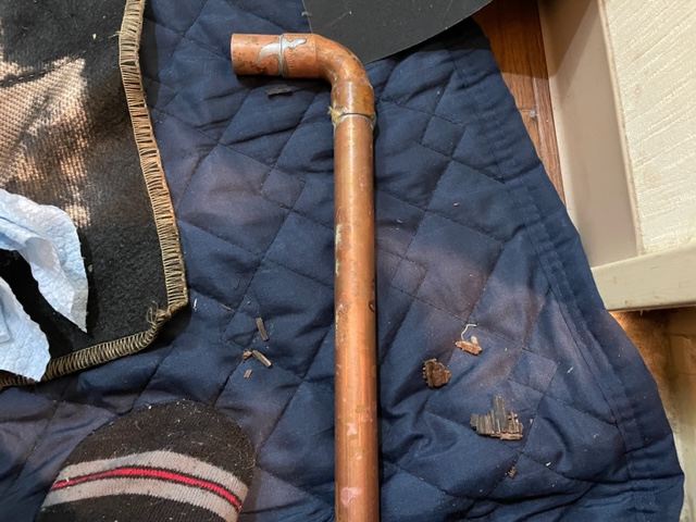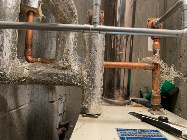 上階のボイラー配管がピンホールして階下漏水しており、ピンホールした配管を溶接補修して改善しました。