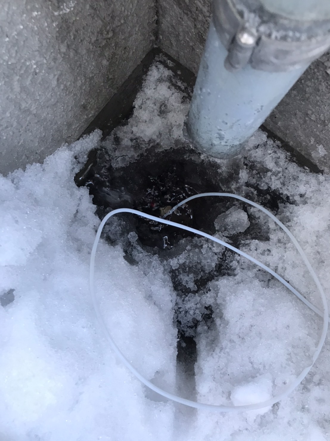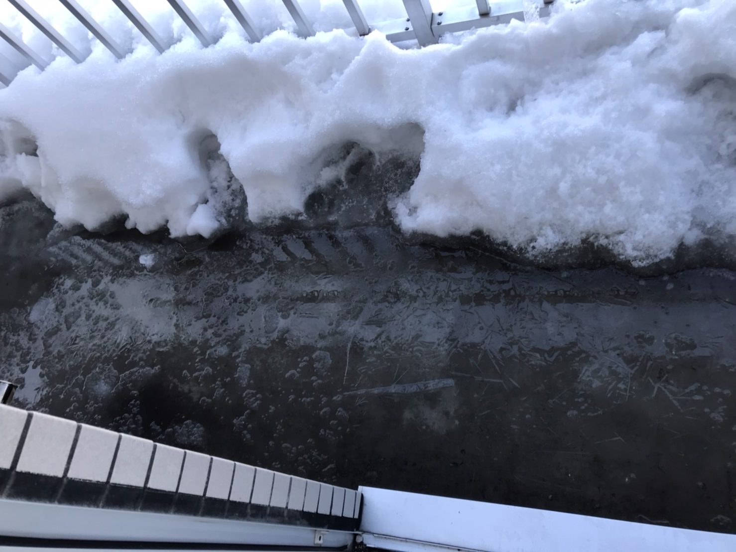 上階を確認するとベランダにあるドレン配管が凍結して塞がれており、逃げ場が無くなっていたようです。