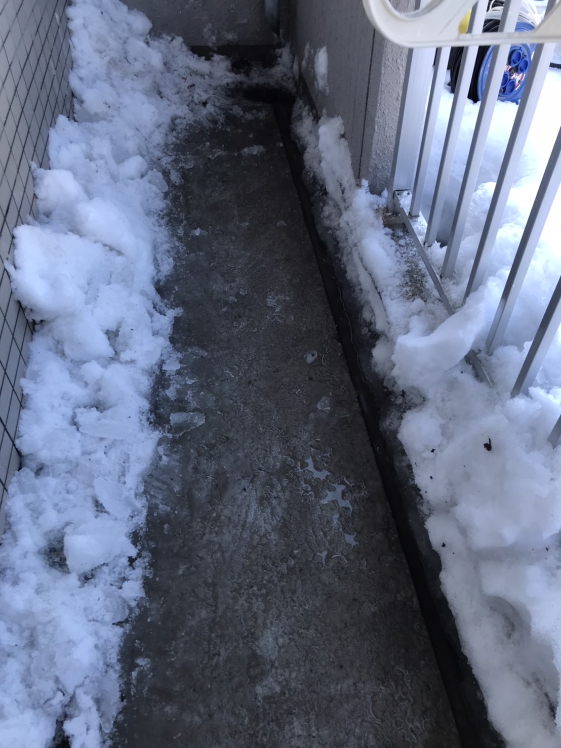 スチーム解氷機を使用して排水に溜まった氷を溶かして道を作り、ベランダの水はスムーズに流れるようになりました。
