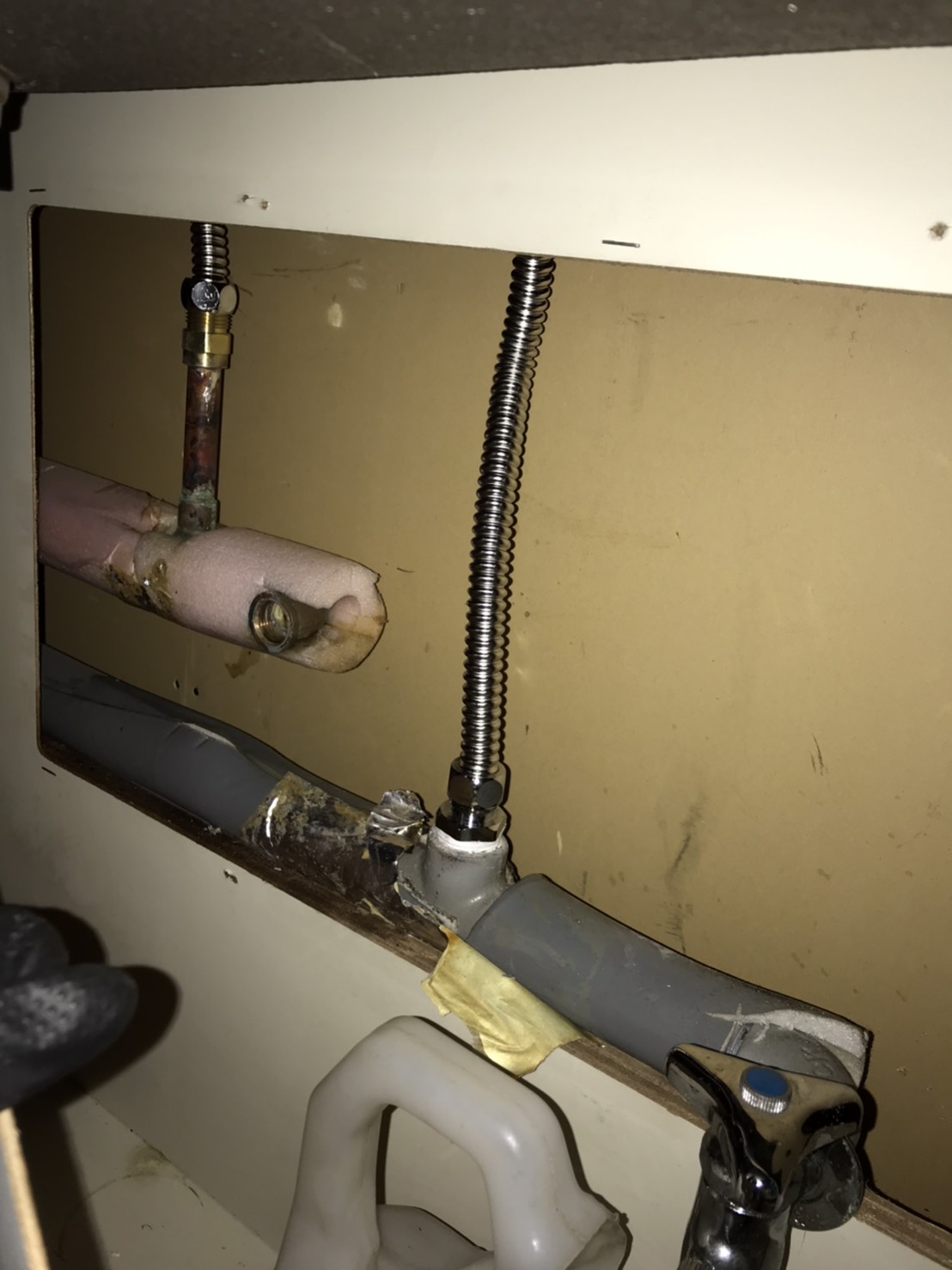 応急処置でどうにかなるものではなかったので、水漏れしている管を取り外し新しくフレキ管で繋ぎなおしました。