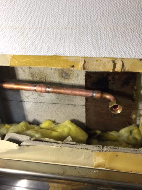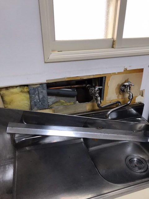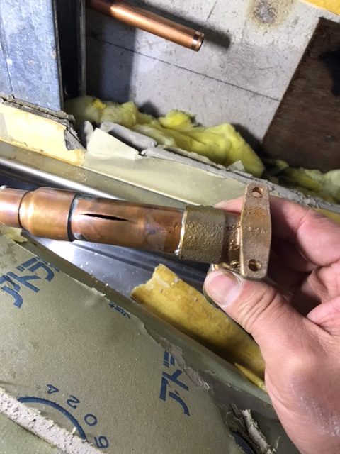 今日は、提携会社からの依頼で入居したばかりで水を使用したら台所の裏から水が漏れて来たので見てほしいとの件で行ってきました。点検すると台所の裏から水漏れの音がします。壁のステンレスをめくりクロスを開口するとお湯側の銅管が破裂してました。管理会社様に連絡し補修の承諾を得て修理し改善しました。まだまだ凍結の余韻が残ってました。。。