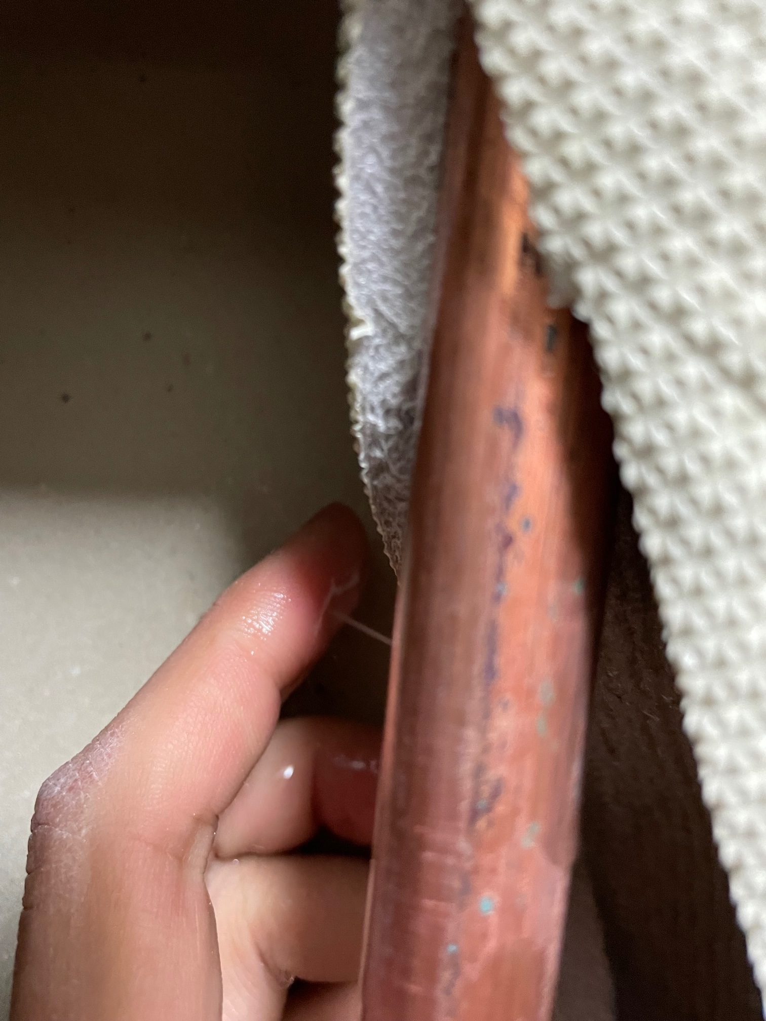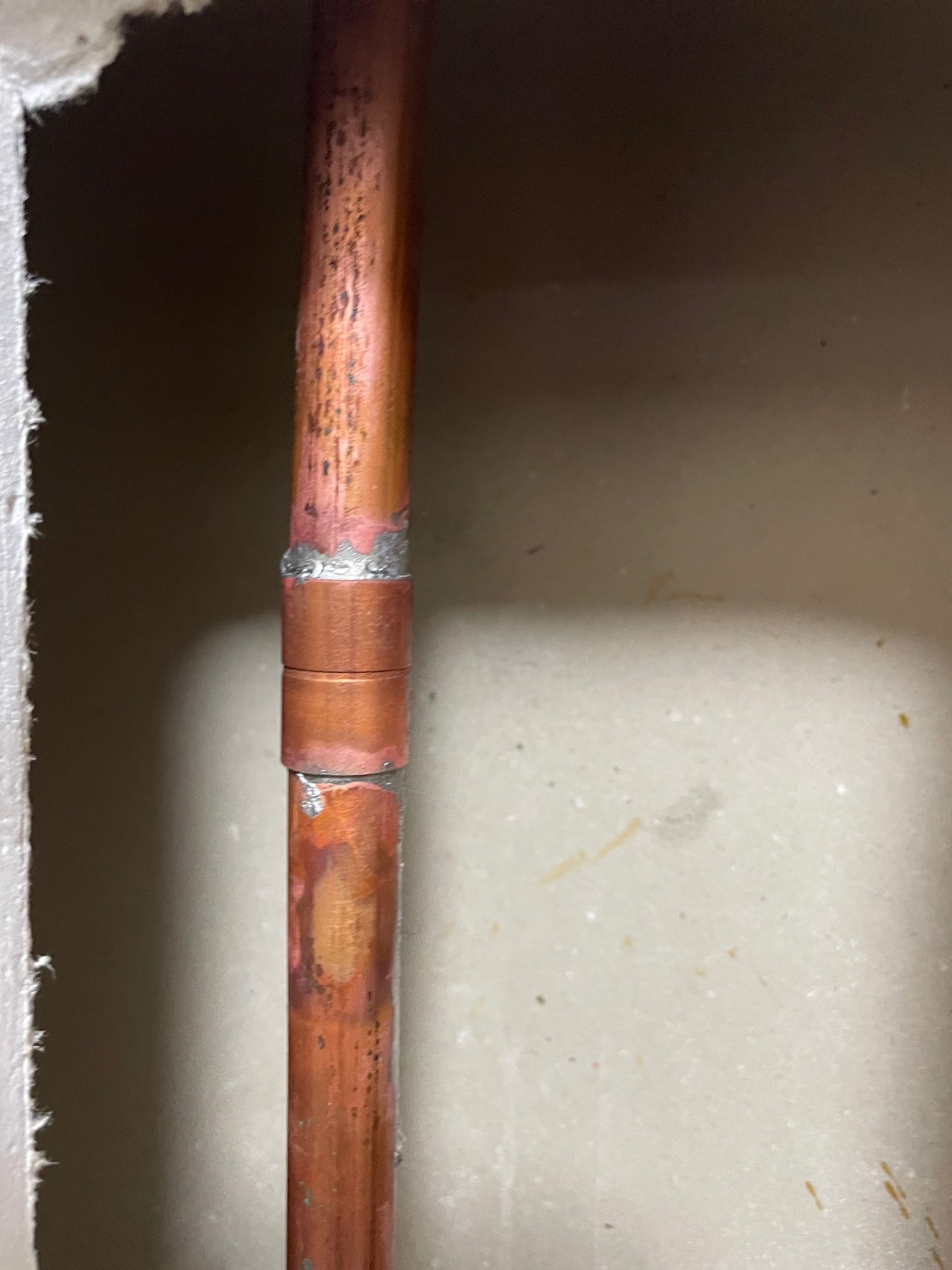 壁を開口して直接配管を調査すると、銅管で引かれた配管の一部がピンホールして漏れてきていました。