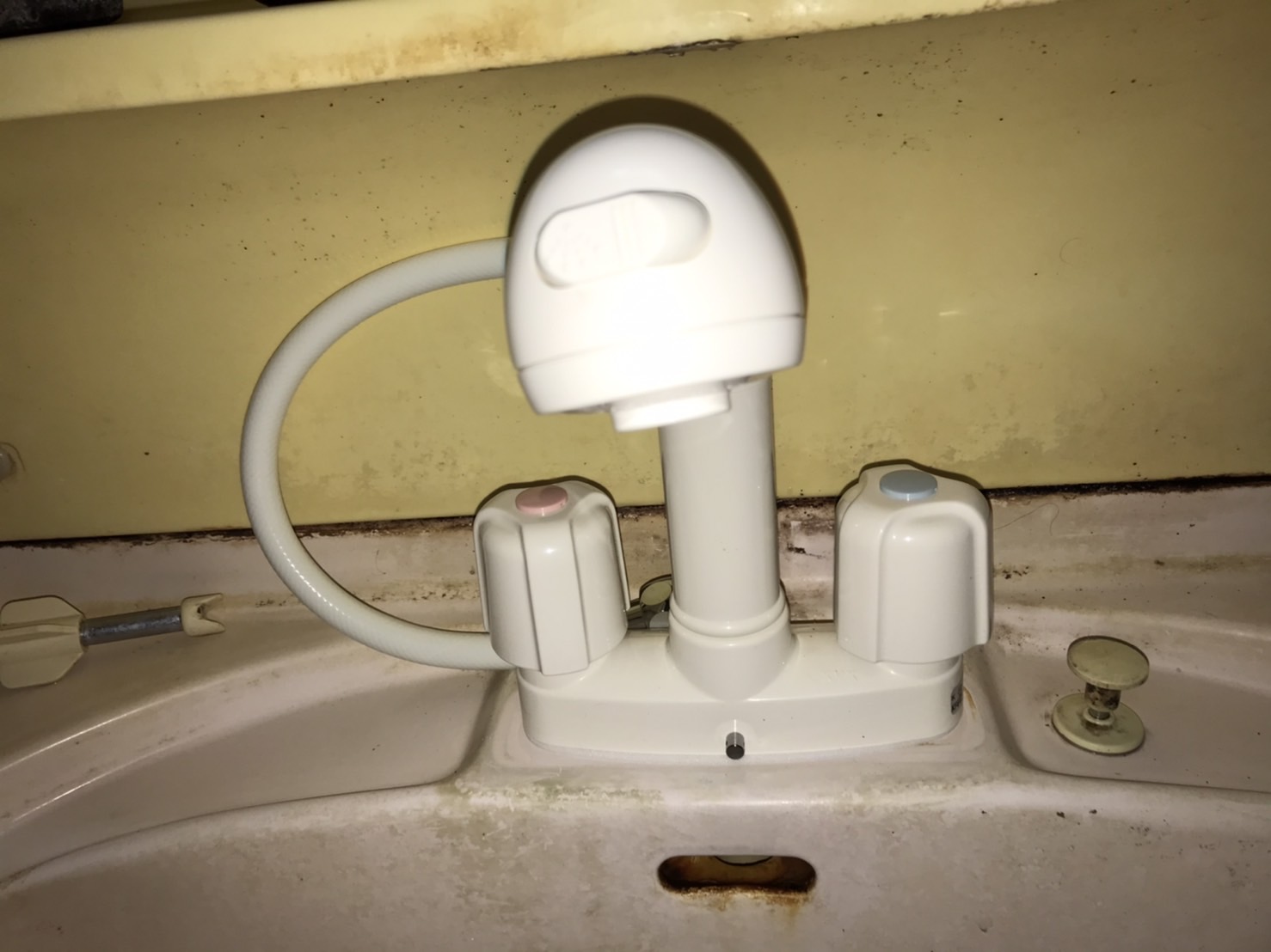 元々の蛇口の同等品はもうないので、ちょっと変わった2ハンドル混合栓をご用意して交換しました。