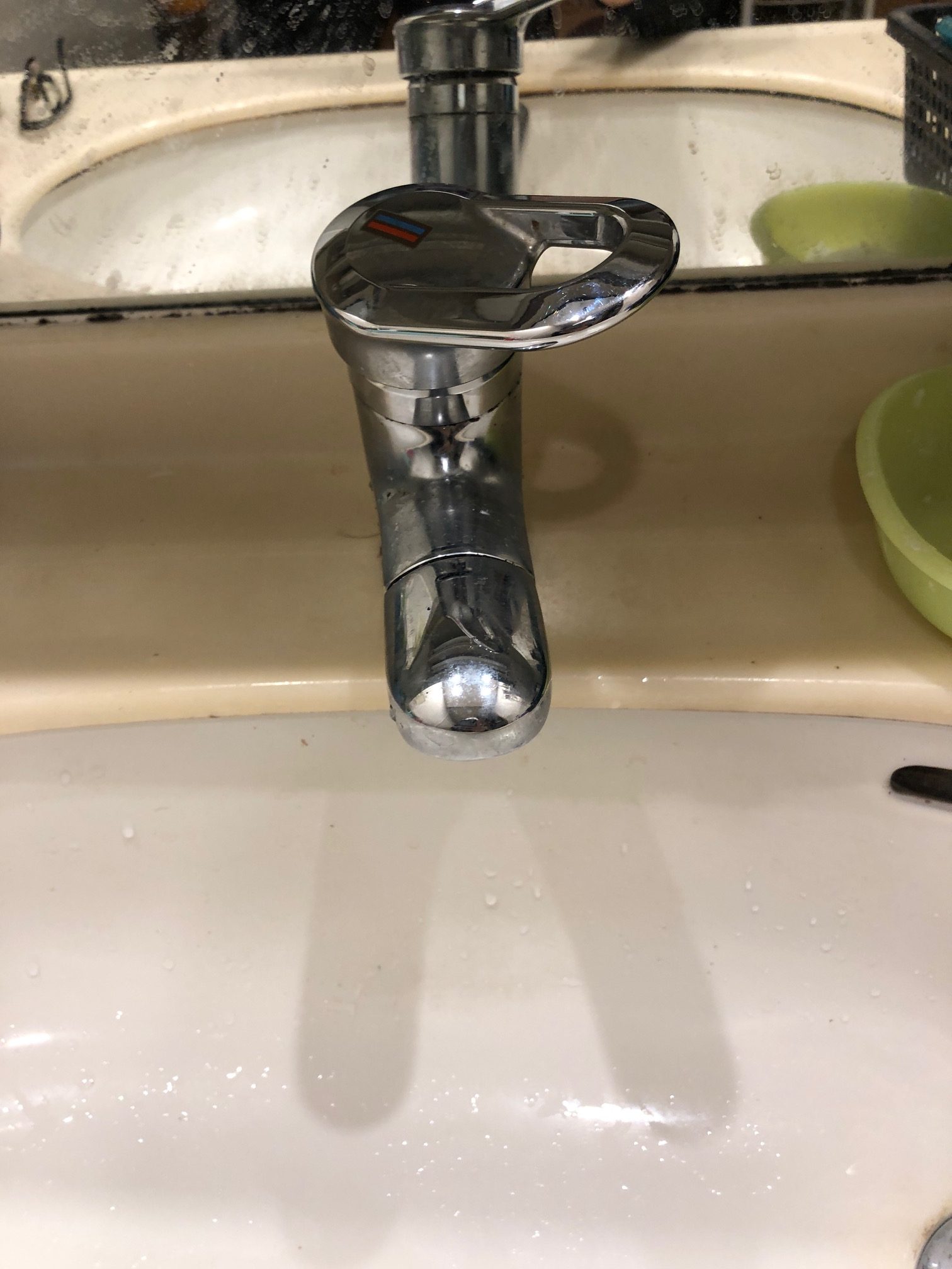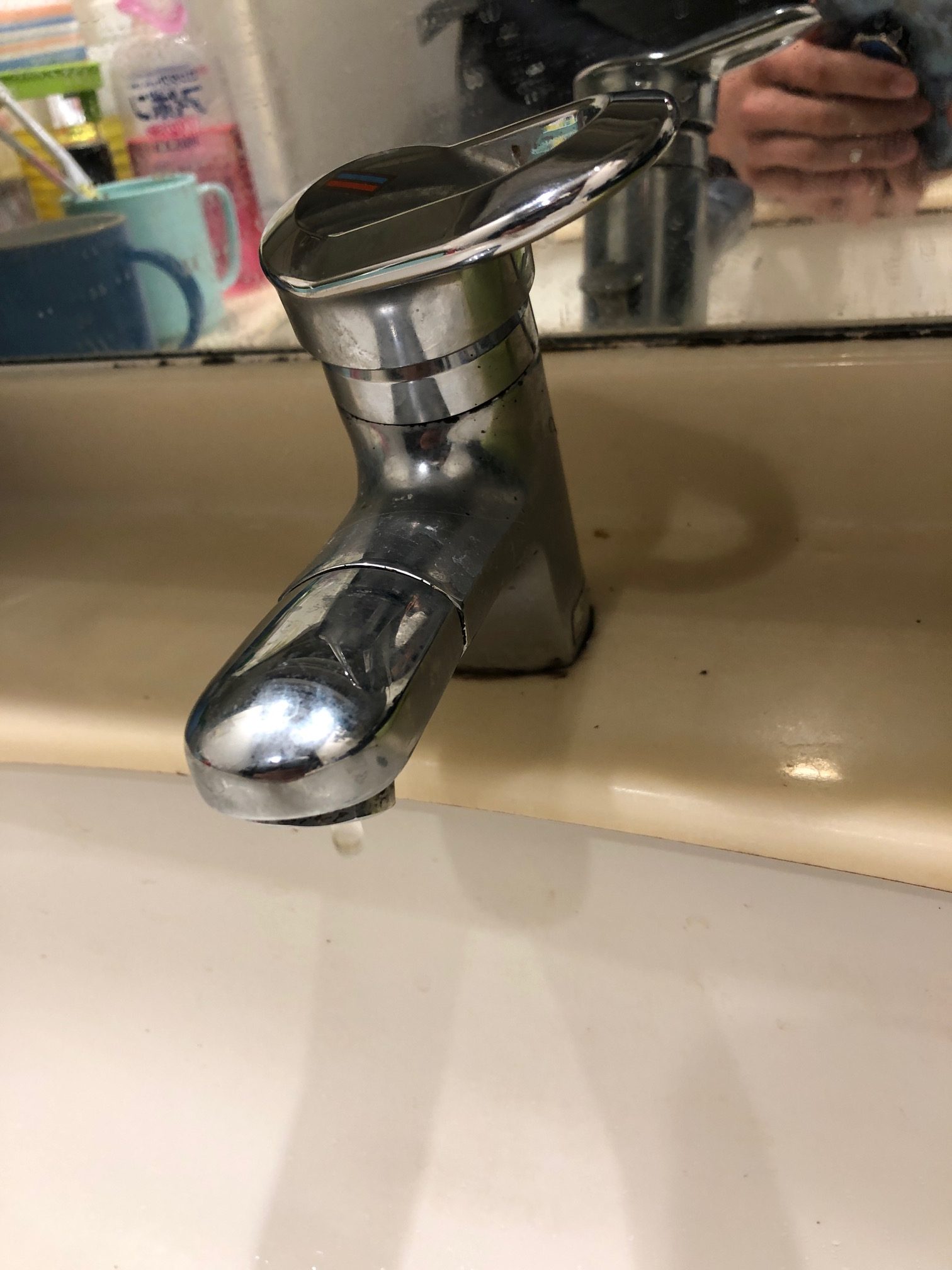 札幌市中央区-洗面水栓吐水口からポタポタ水漏れ・・・レバーを下げても止まらない