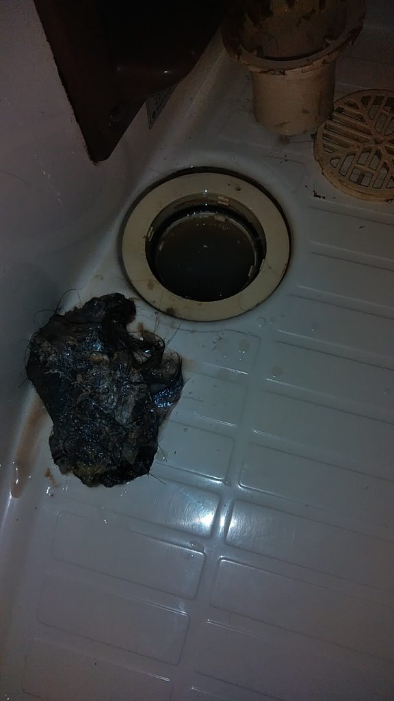 本日は浴槽のお湯を流すと浴室排水口から溢れるとのご依頼があり出動しました。アパートの三点ユニットで排水テストをしてみると排水口から直ぐに溢れてきますね。パッと見ただけでわかるのですが排水トラップを外して掃除していないのが分かります。早速排水トラップを外して手を入れてみると髪の毛がビッシリと詰まっていたため引き出して取り除きました。トラップを元に戻して排水テストをすると快調に流れました。あまりの大量の髪の毛にお客様自身が引いていましたが、トラップの外し方をお教えして掃除をこまめにして頂くようにお願いするとニコっと恥ずかしそうにお礼を言っていただきました(;^ω^)