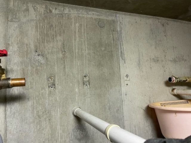 コンクリートの壁に横に引かれた配管で、通水状態だと漏れた水がポタポタ落ちていました。