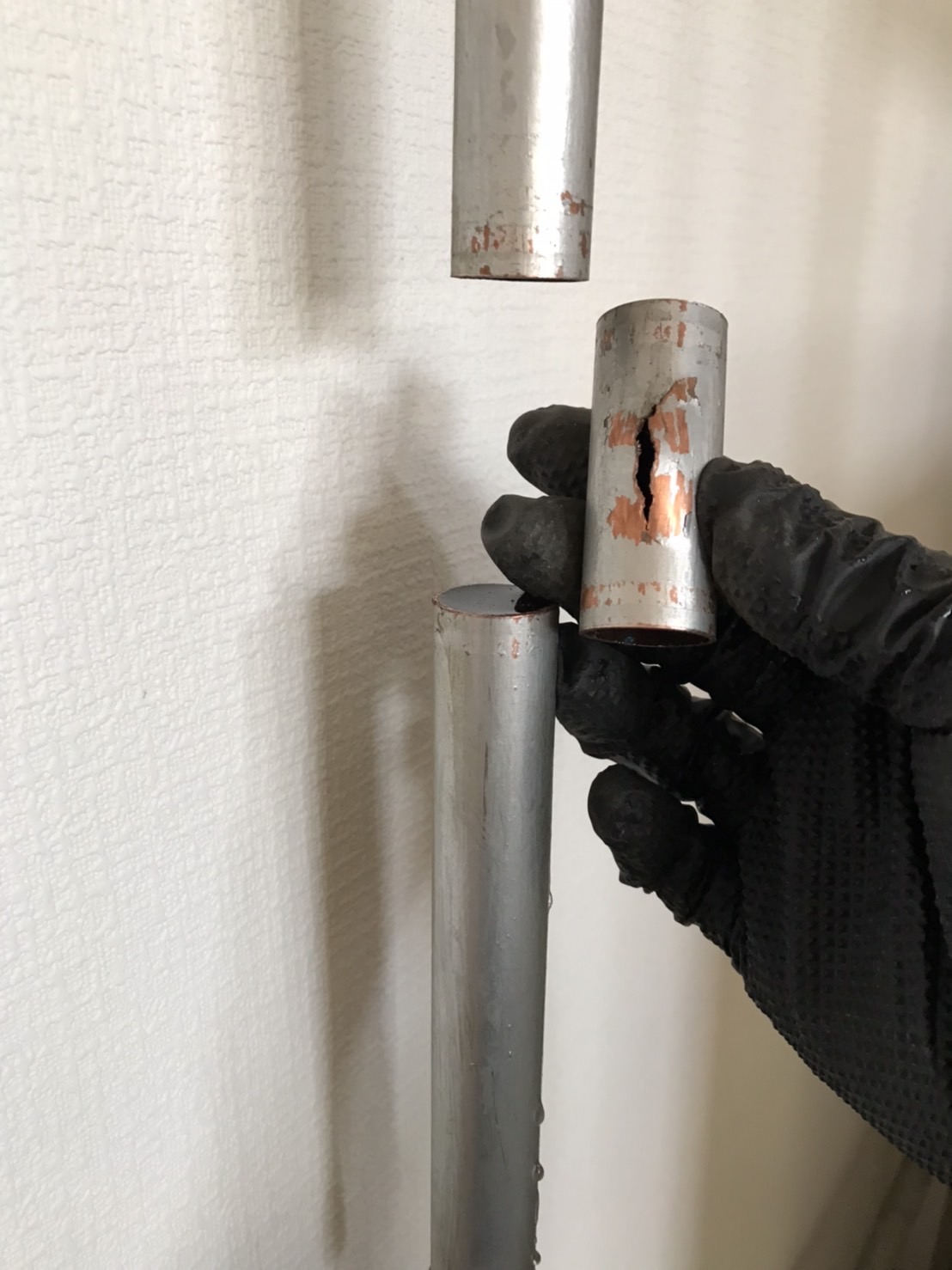 お伺いすると破裂して管が裂けていたので、新しい銅管にて溶接補修をして改善しました。