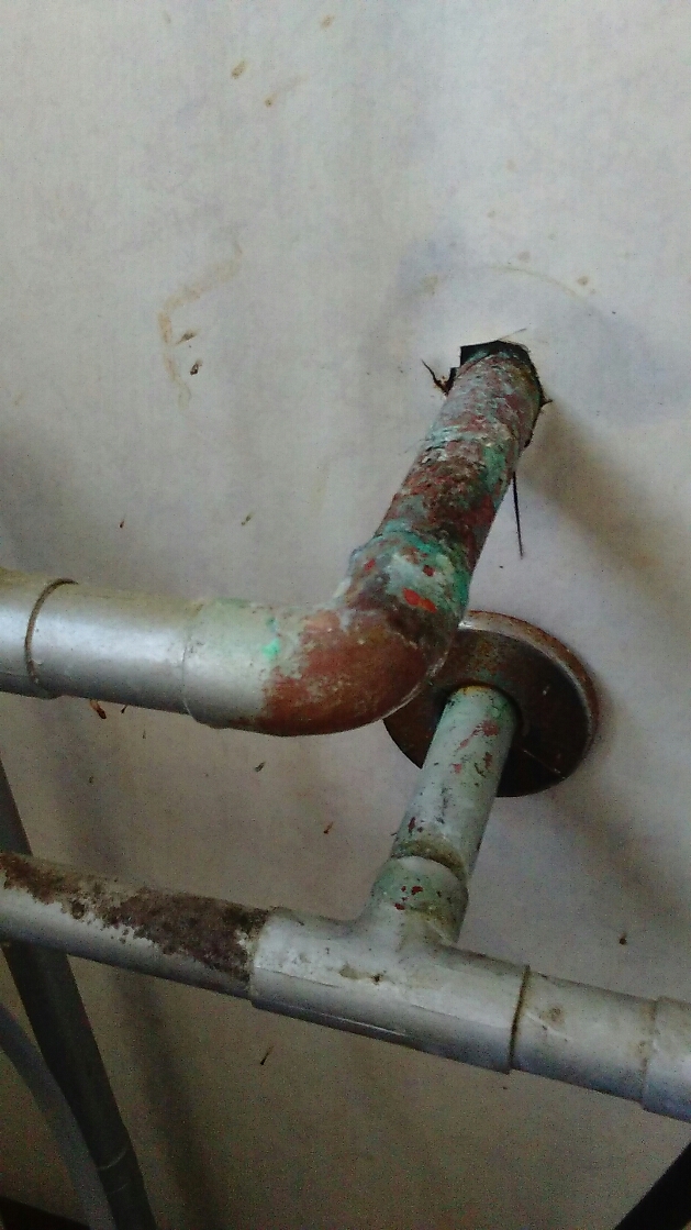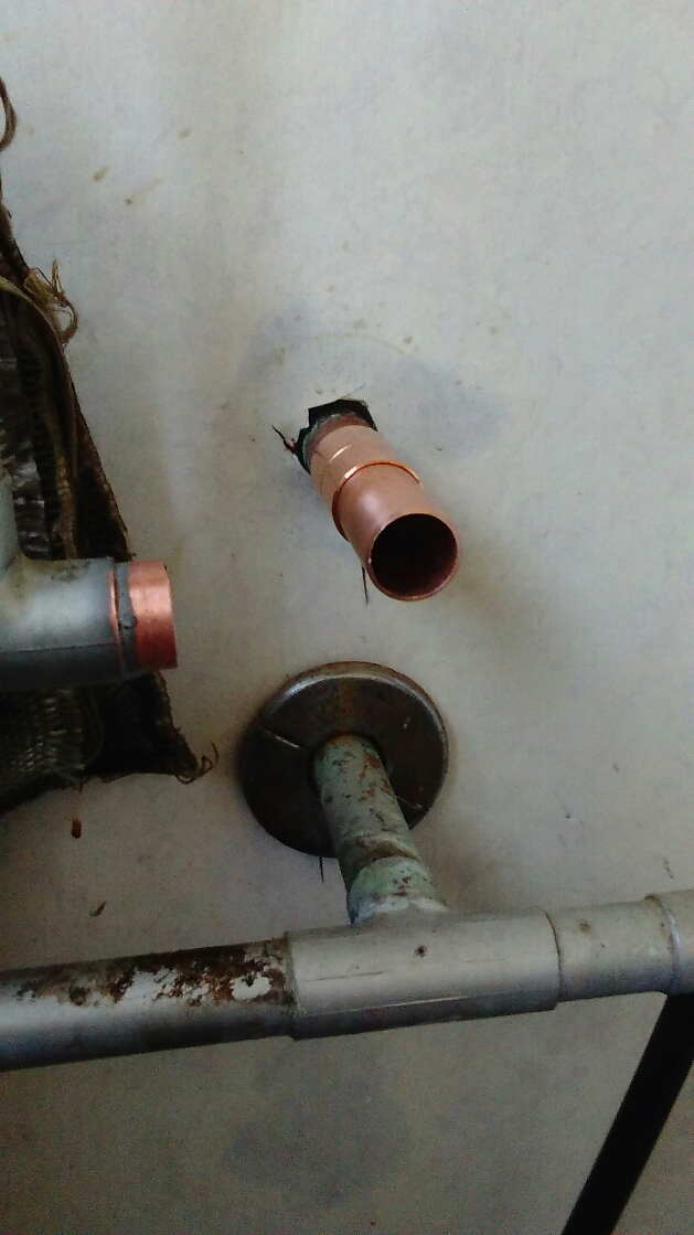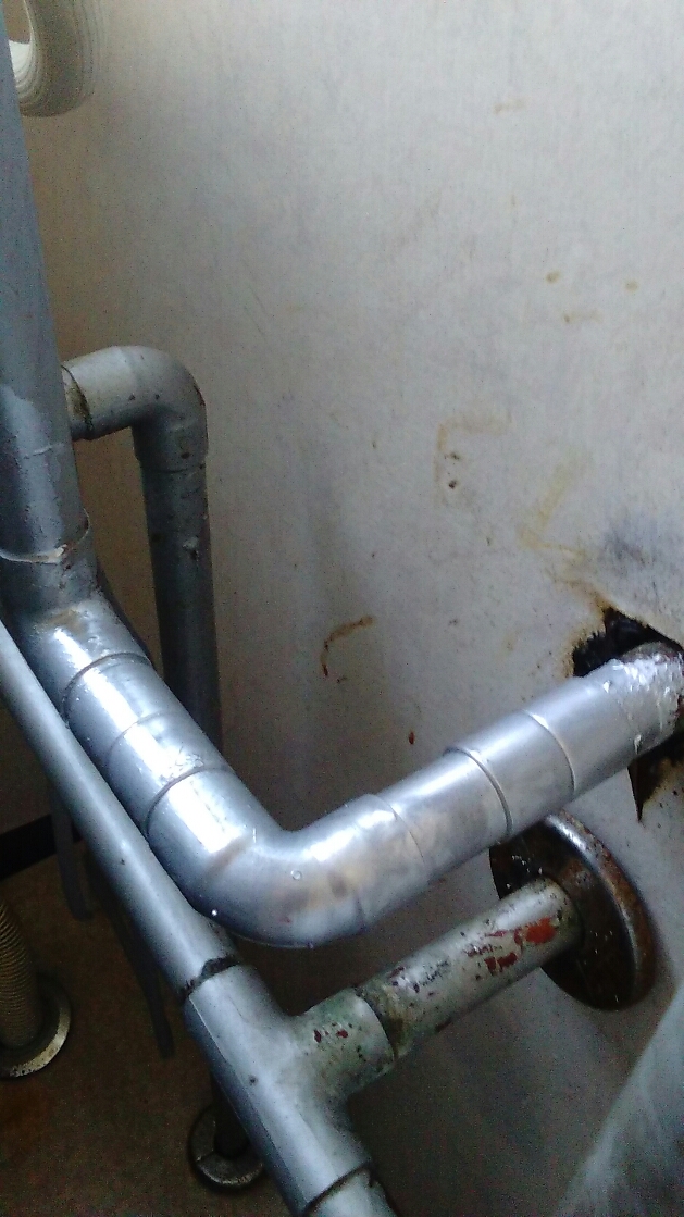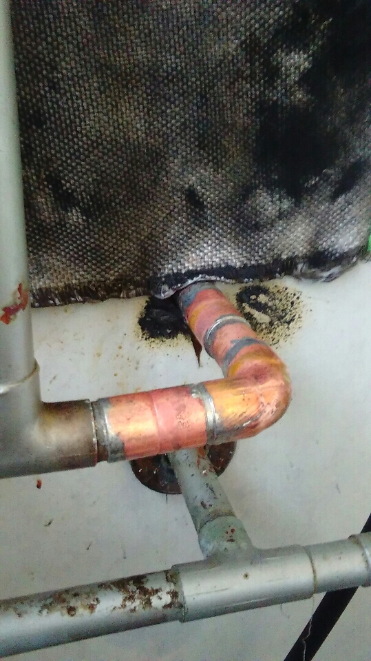 本日は提携企業からの依頼でボイラーの後ろの配管から水漏れしているので直して欲しいとの案件です。拝見するとかれこれ25年経っている銅管です。腐って穴が開いている所から漏れています。場所が場所で狭い所なので大変でした。。。水漏れしている所を切って補修して塗装して改善しました。