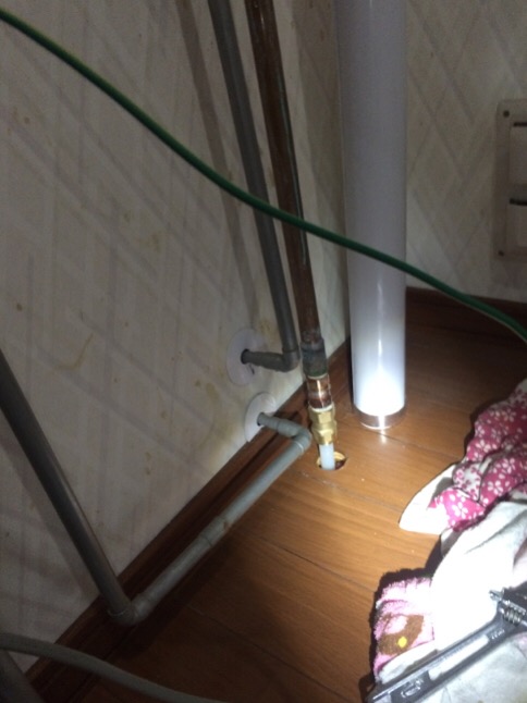 電話した時には元栓で止水していたらしく到着した時には水は止まっている状態でしたが、お客様は家中の床の拭き取り状態で迎えてくれました|д゚) 朝7時位に家を出てから無人状態の家で、お客様が帰る夕方6時位までの間に何時からか家の中で水漏れが発生した模様でした。帰って来たら水深2センチ位の深さで、水がリビングあたりまで来てたらしいです。お客様に状況を聞くと壁掛けボイラーの下あたりから音と水が出てたと証言がありましたので点検してみると 給湯パイプを保温している断熱材を剥ぐと、なんと!