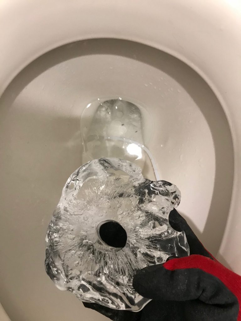 お客様から入電があり、トイレの水が溜まっているところが凍って用を足せないとご依頼いただきました。