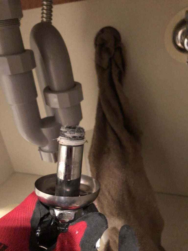 収納内を調べてみると、シンクの奥から伸びている配管のつなぎ目からの水漏れでした。