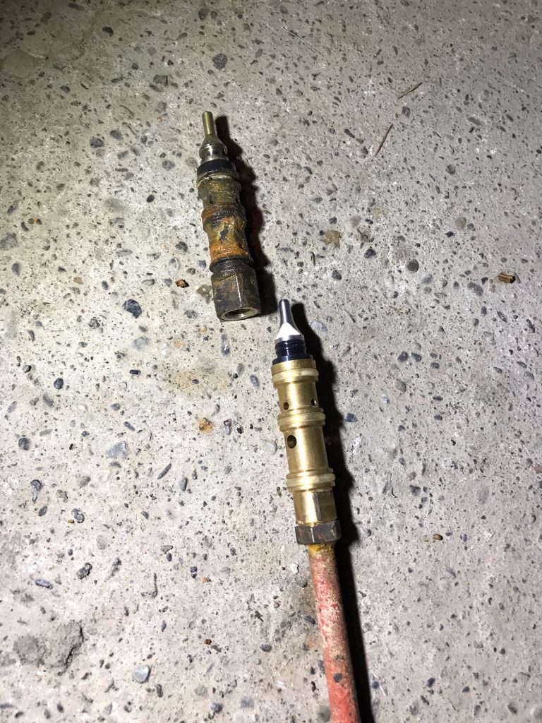 原因は刺さっているシャフトのピストンが腐食に腐食を重ねていたため、こちらを交換して改善しました。