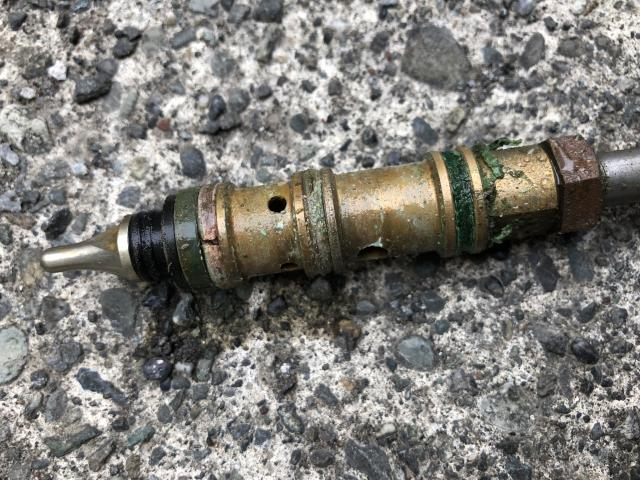 水道メーターで水を止めて、元栓のシャフトを見ると先端のパッキンが粉々になっていました。