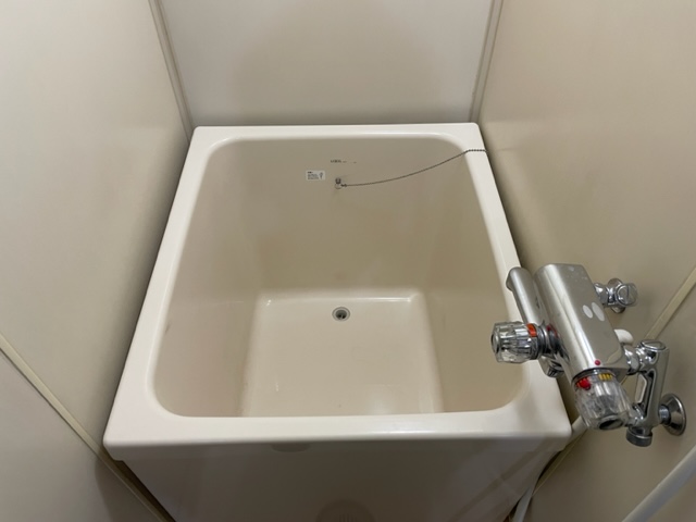 浴室はかんり古い造りとなっており、新しいものではありますが正方形の浴槽が設置されていました。試しに状況を確認するために手を置いてみると、かなり浴槽が傾く状態でこれでは使用は困難ですね。