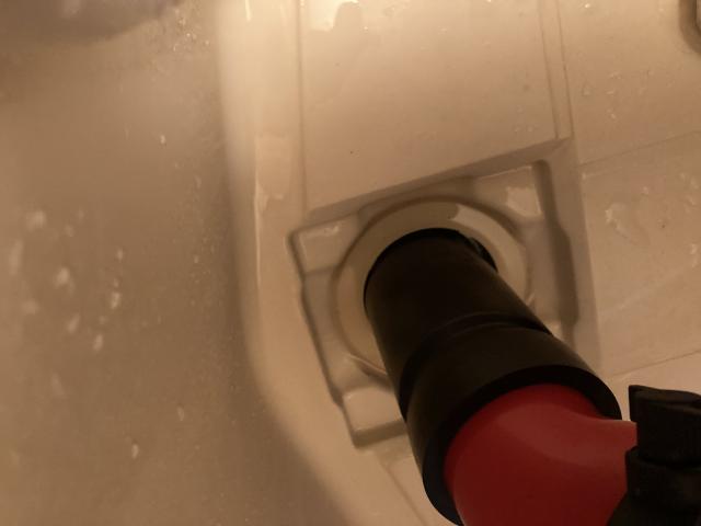 排水用のポンプを使用し数回押し引きすると、水位はしっかり下がり詰まりも解消されました。