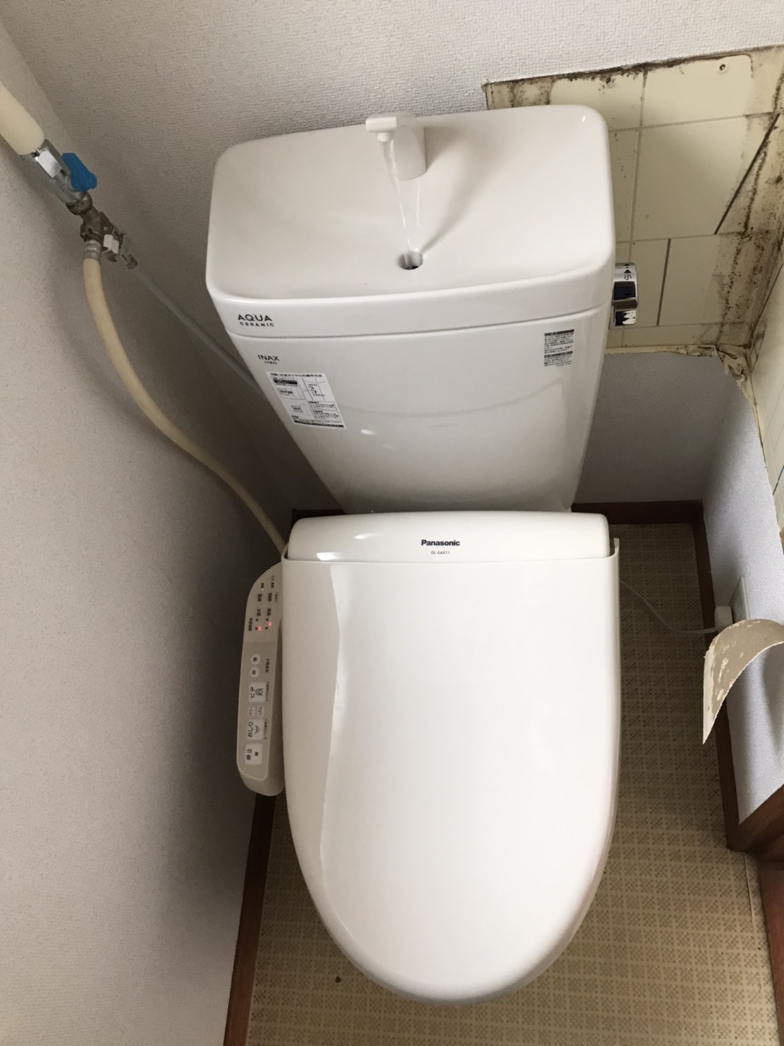 今までは隅付タンクと呼ばれる古いものでしたが、便器の上にタンクのあるタイプに変更しました。