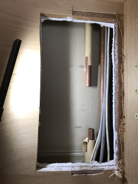 壁の中に隠れているため、台所裏を開口し調査をすると、配管の一部がピンホールしていました。