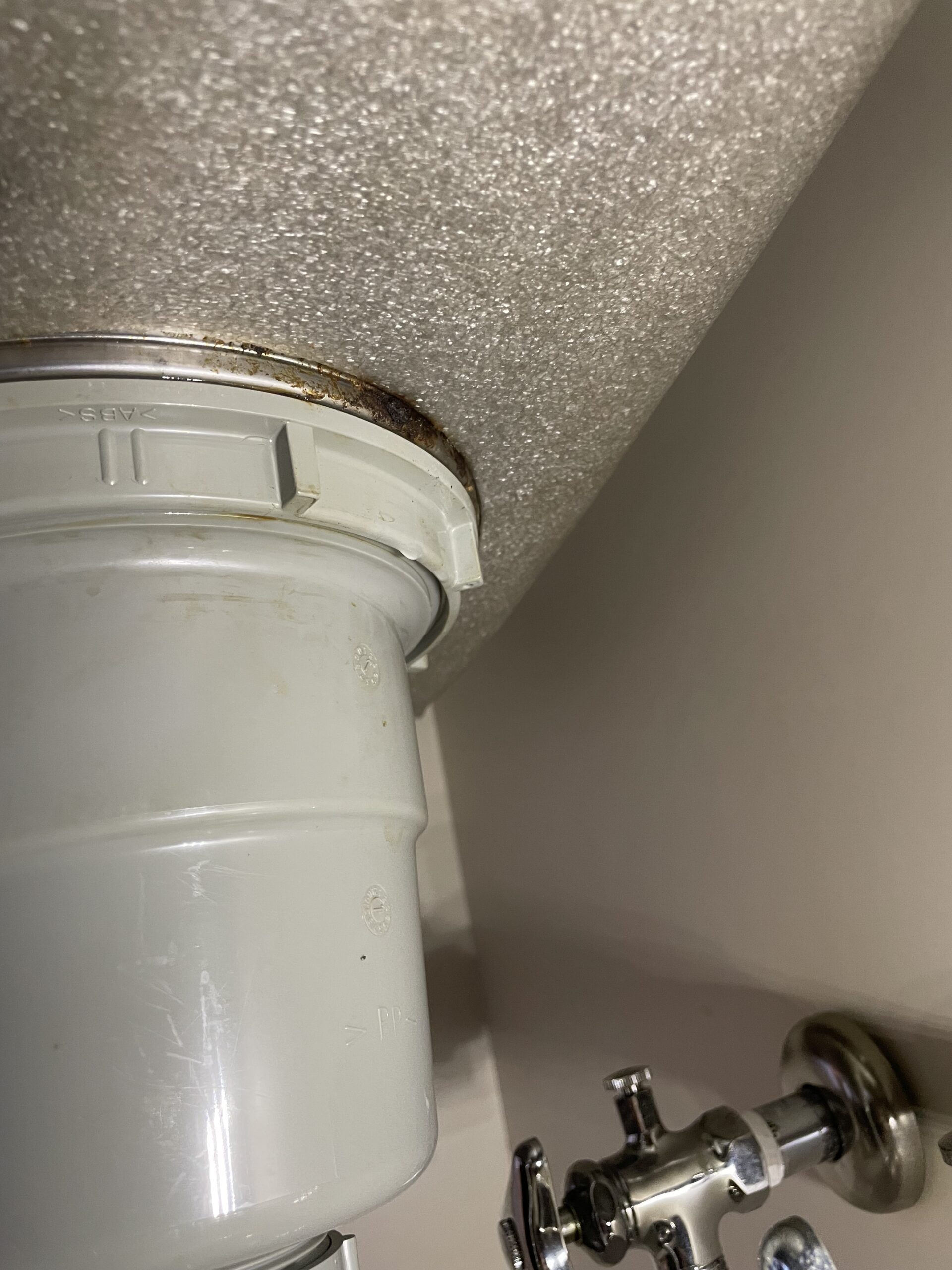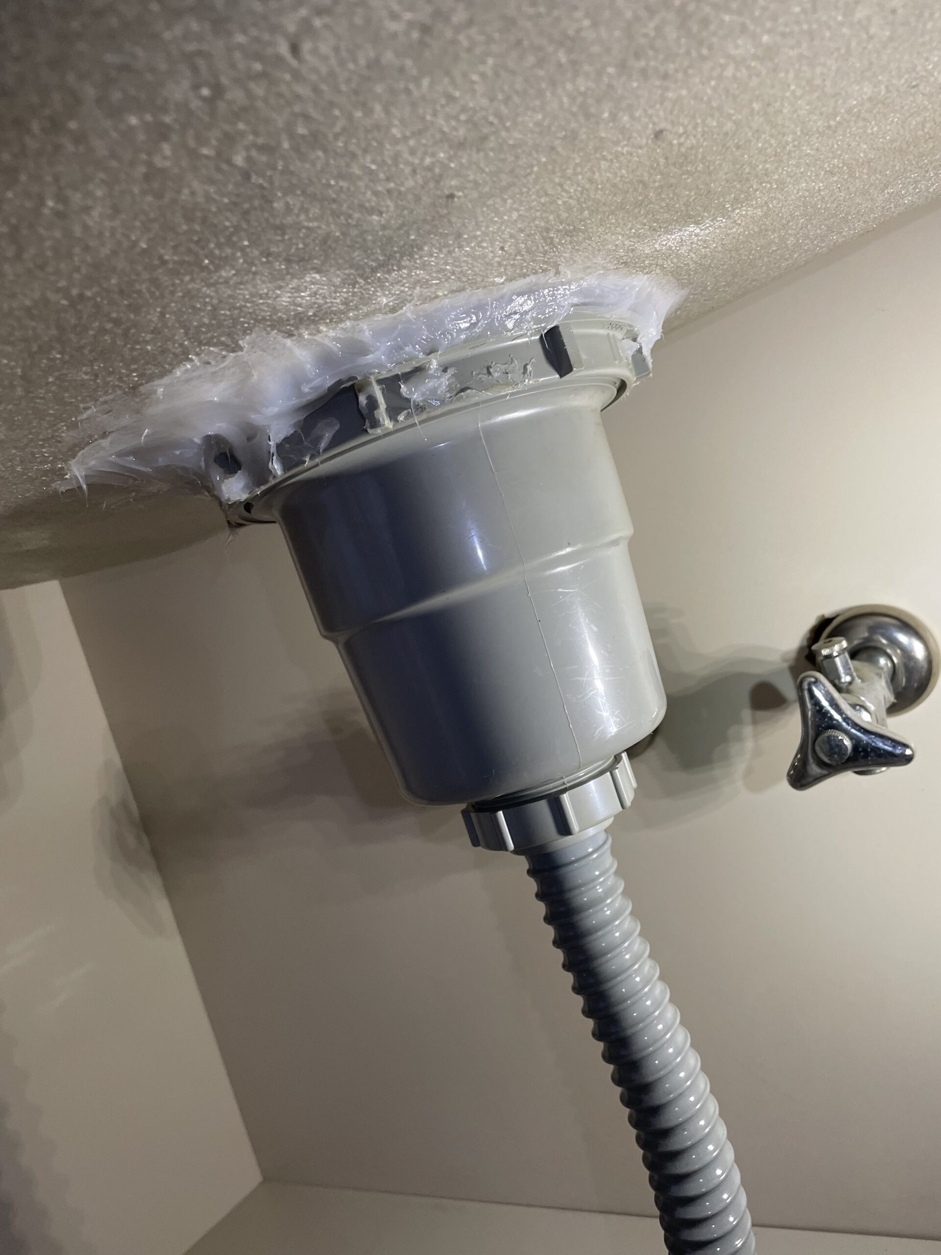 排水トラップ接続部錆びて穴が開いている。コーキング補修で改善