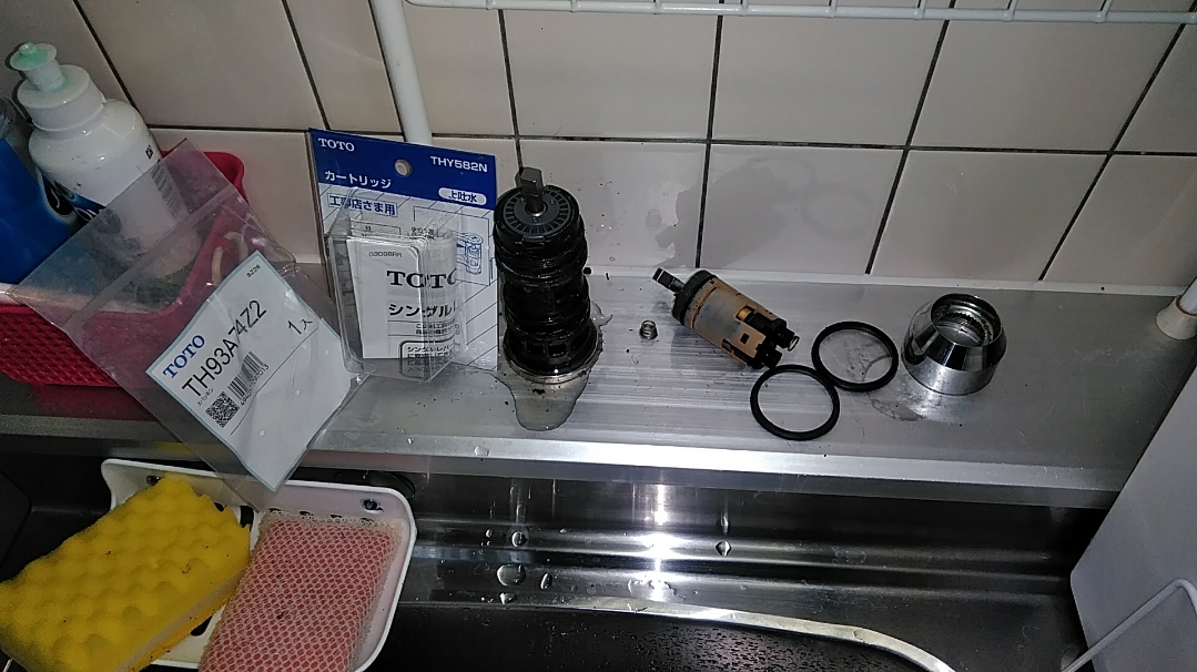 本日は蛇口本体から水漏れするとのご依頼があり訪問しました。ご使用の蛇口はシングルレバー混合水栓でレバー根元と蛇口の回転部分からの水漏れです。T社製の製品ですがカートリッジとパッキンが原因で水漏れするため両方とも交換です。15年以上経ったT社製のカートリッジは外しただけでバラバラになっていしまう程、劣化しているケースも多く今回も外すとバラバラになりました。カートリッジとパッキンを交換して無事水漏れも止まりお客様も即日対応で大変喜んでいただきました。