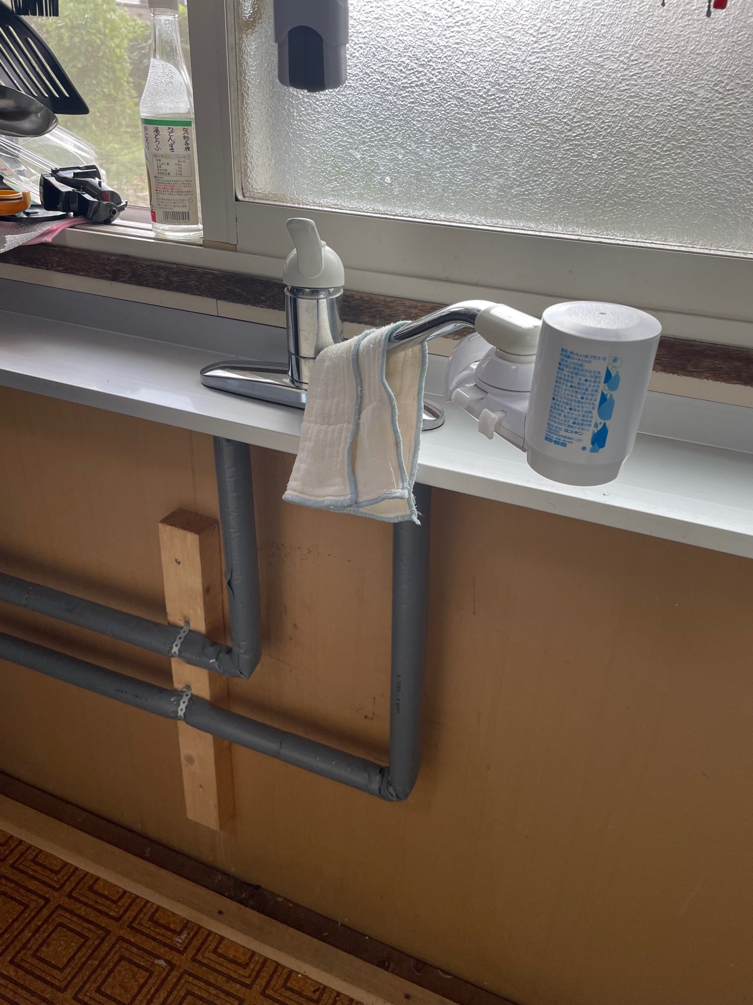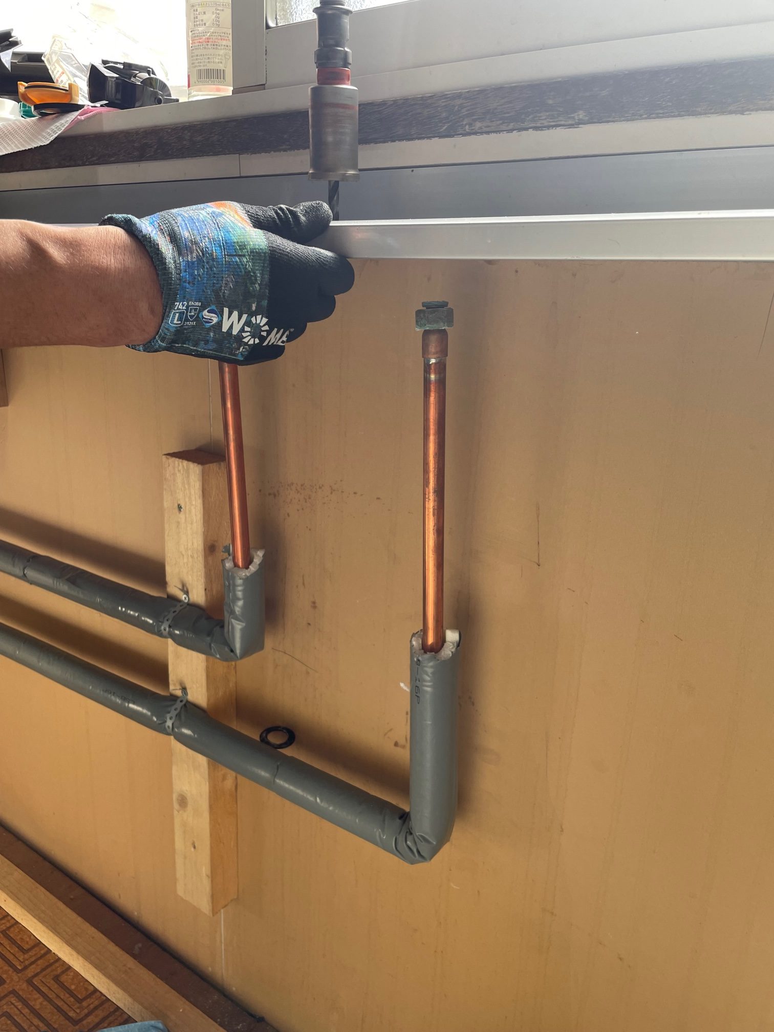 台所を外させて頂き、2ホールの混合水栓から1ホールの混合水栓へ交換だったため穴あけ作業と配管加工作業を行い取付。