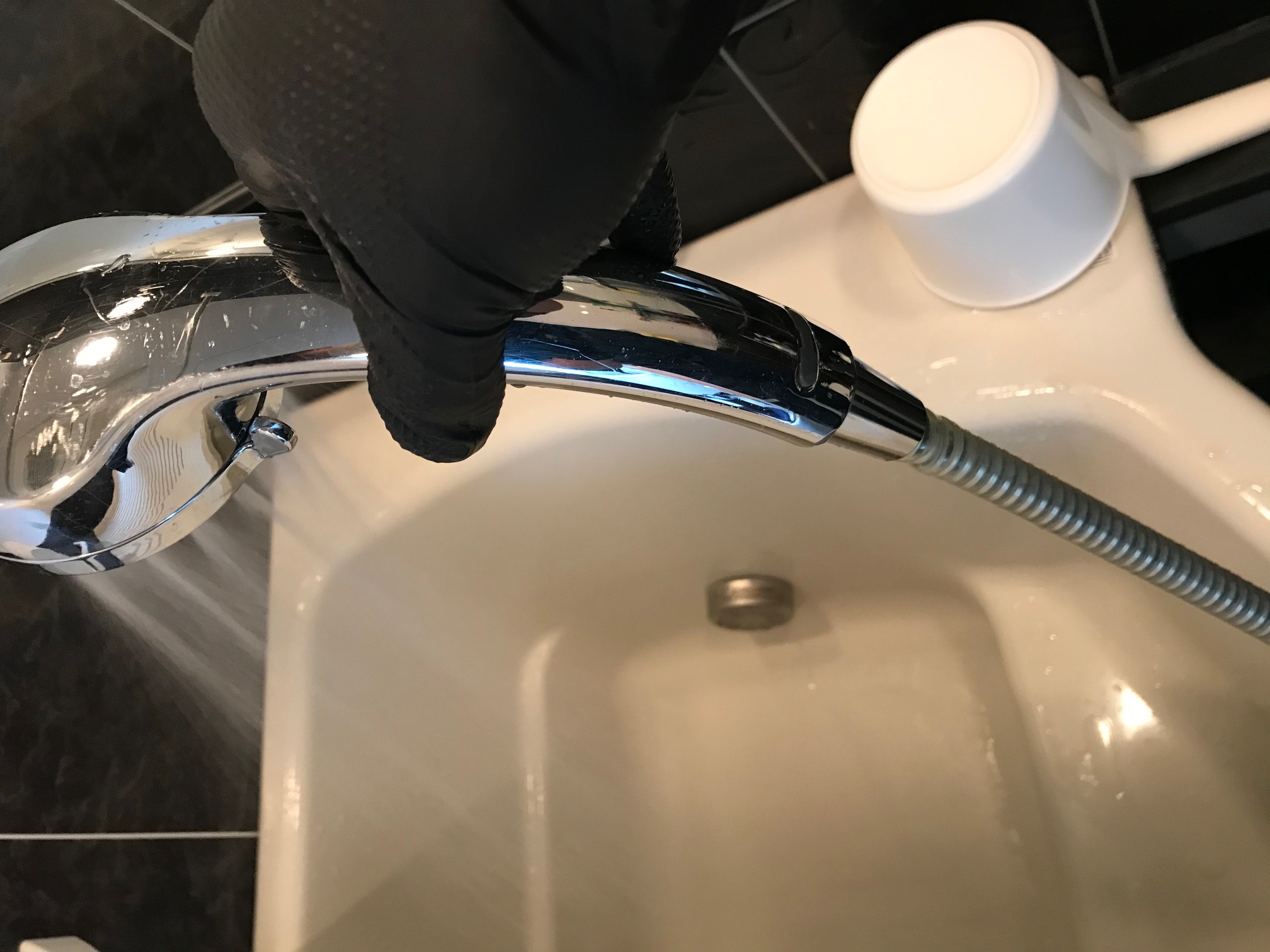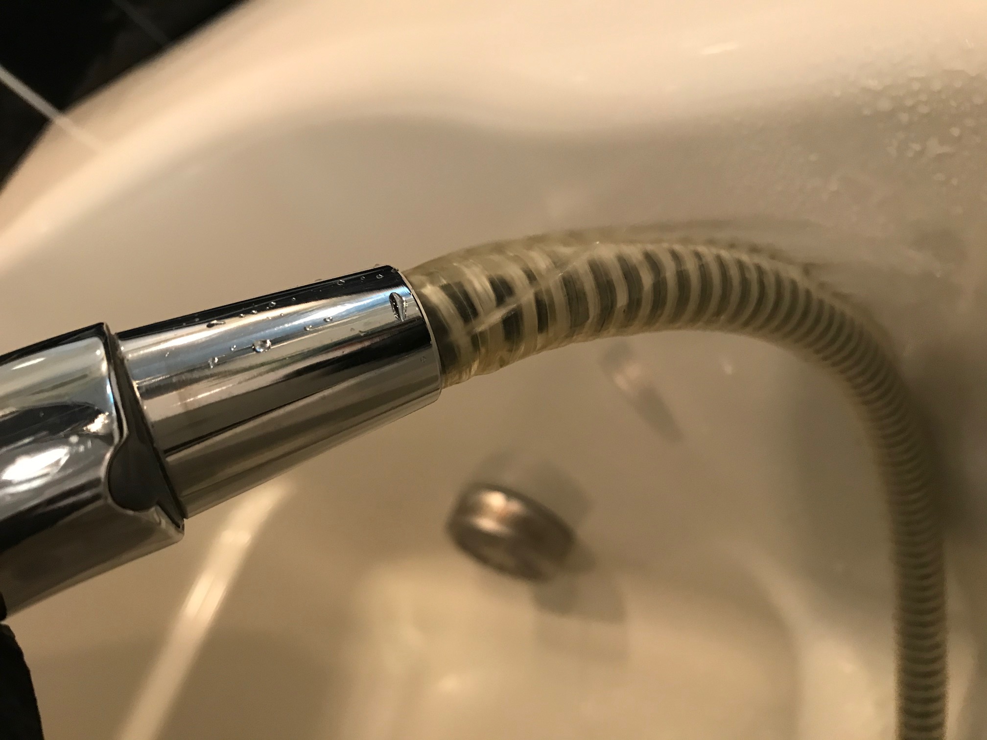 水漏れ箇所は、シャワーホースとヘッドの繋ぎ目からで、シャワーを使用すると隙間からダバダバ漏れてきていました。