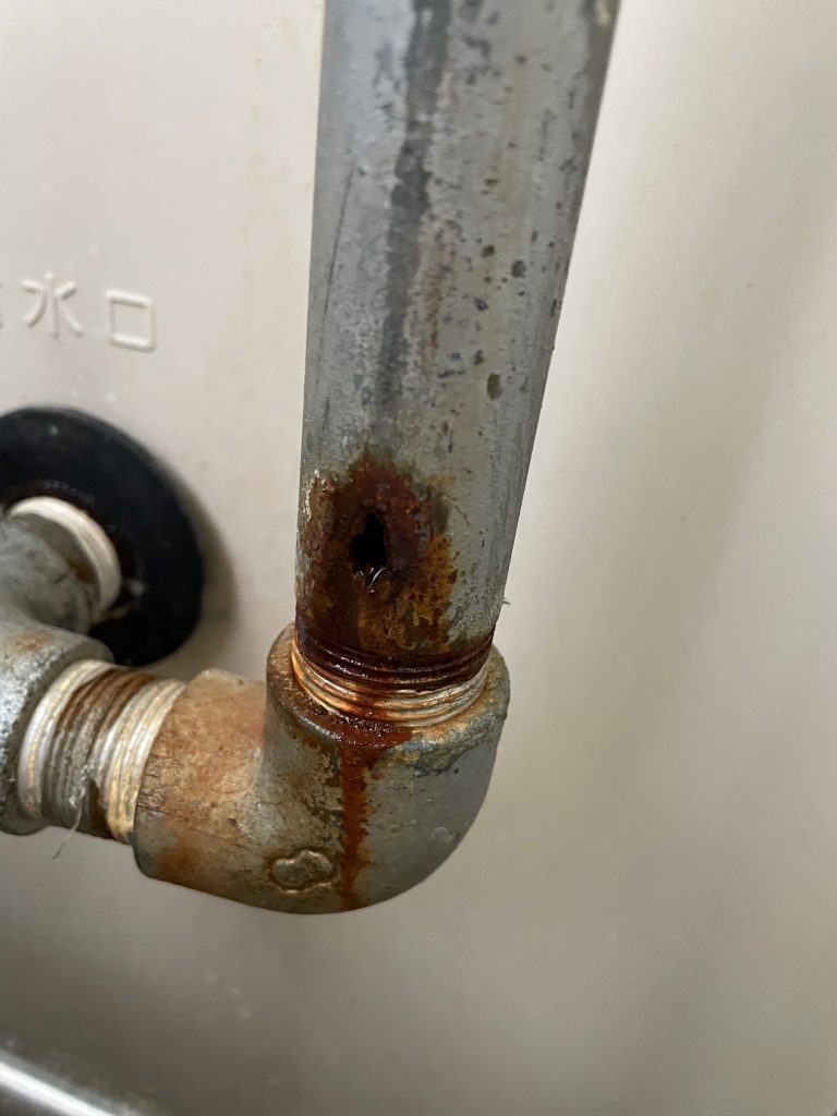 噴き出してきたという場所を確認すると、配管に穴があいてしまっていました。