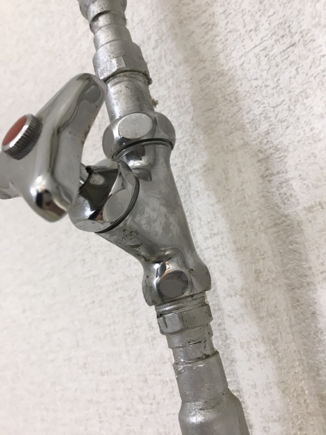 各径路の水を遮断するために付いている止水栓と呼ばれる部分のハンドルの根本からの水漏れでした。