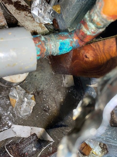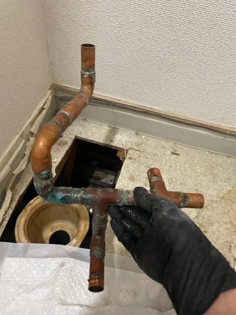 上階床を開口し配管を確認したところ穴があいており水漏れしていたため、