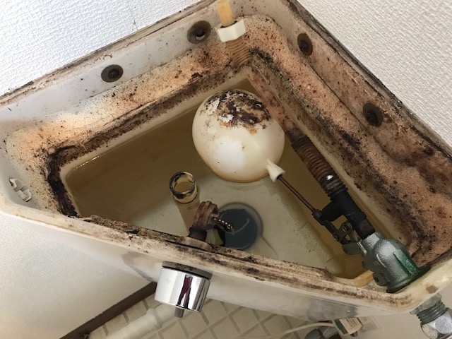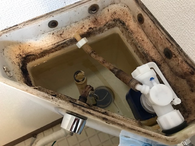 さらに、タンクに溜まる水を開閉するボールタップも劣化しており、いまにもオーバーフローしそうなくらい水位が上がっていました。