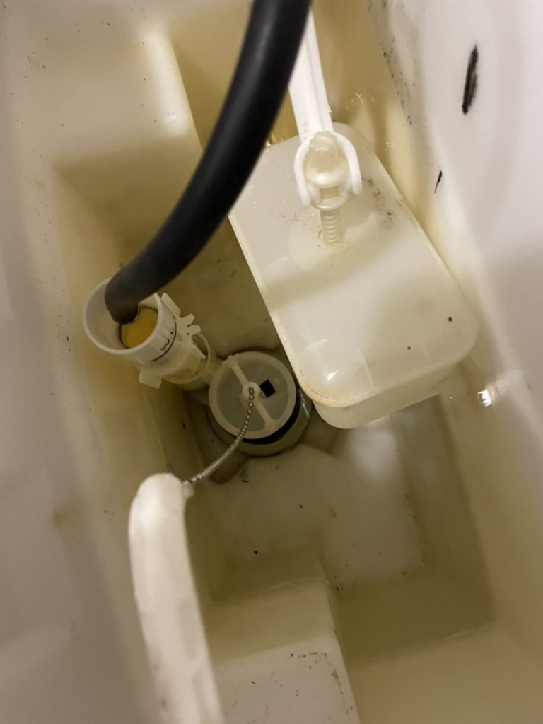 原因はトイレタンク内にあるオーバーフロー管が折れたせいで、タンクを外して管を交換して改善しました。
