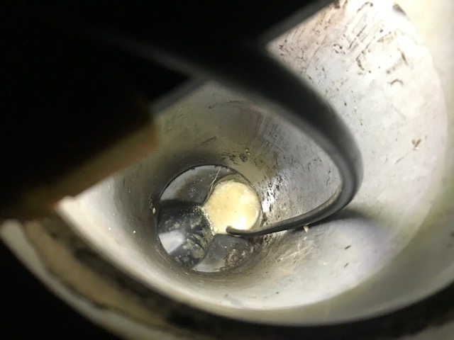 ようやく凝固部分も貫通し、溜まりに溜まった排水が一気に流れ出てきて詰まりは解消されました。