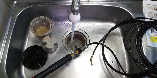 電動の高圧洗浄機を使用し、台所上から管を入れていって奥の配管まで清掃を行いました。