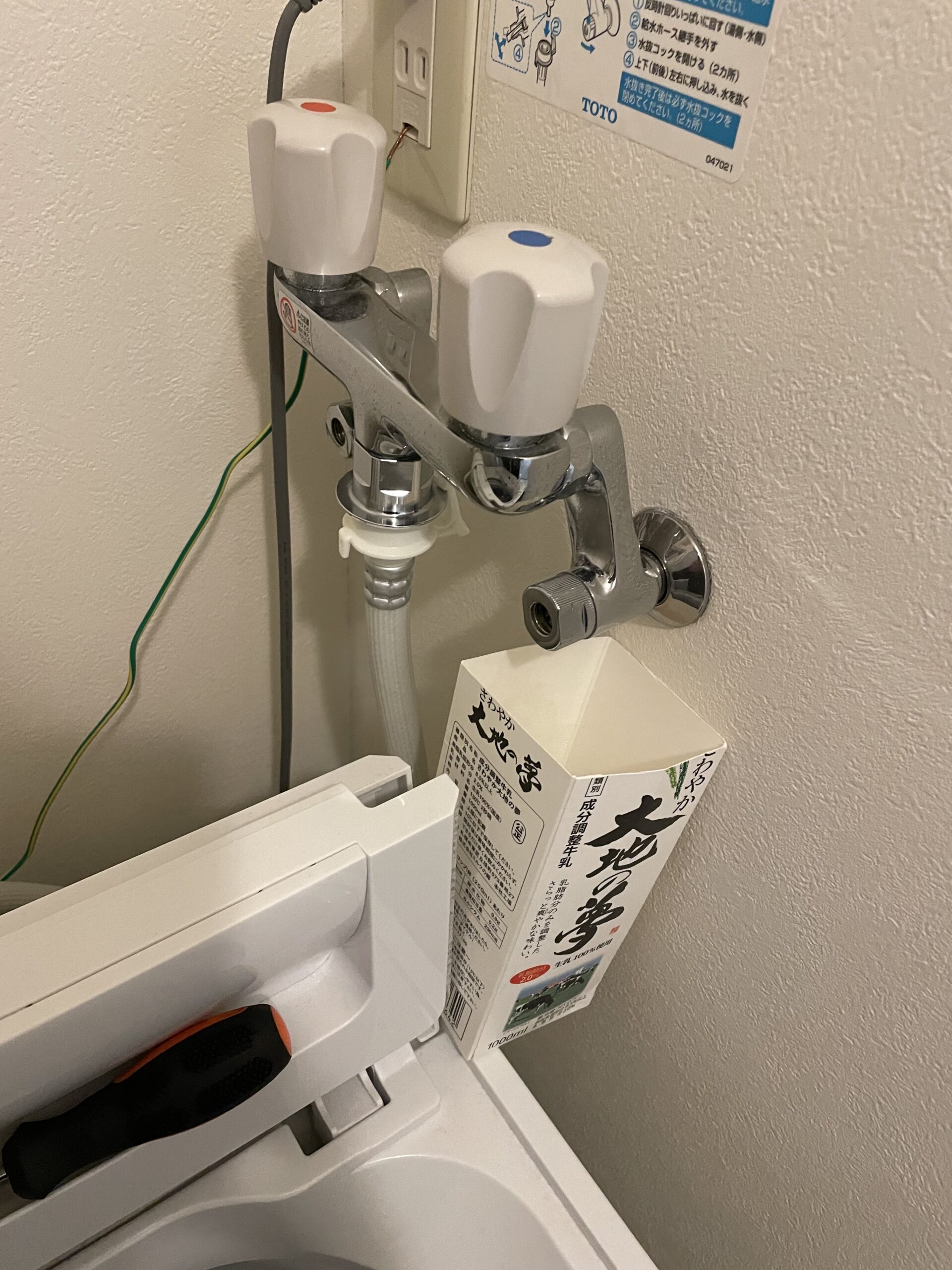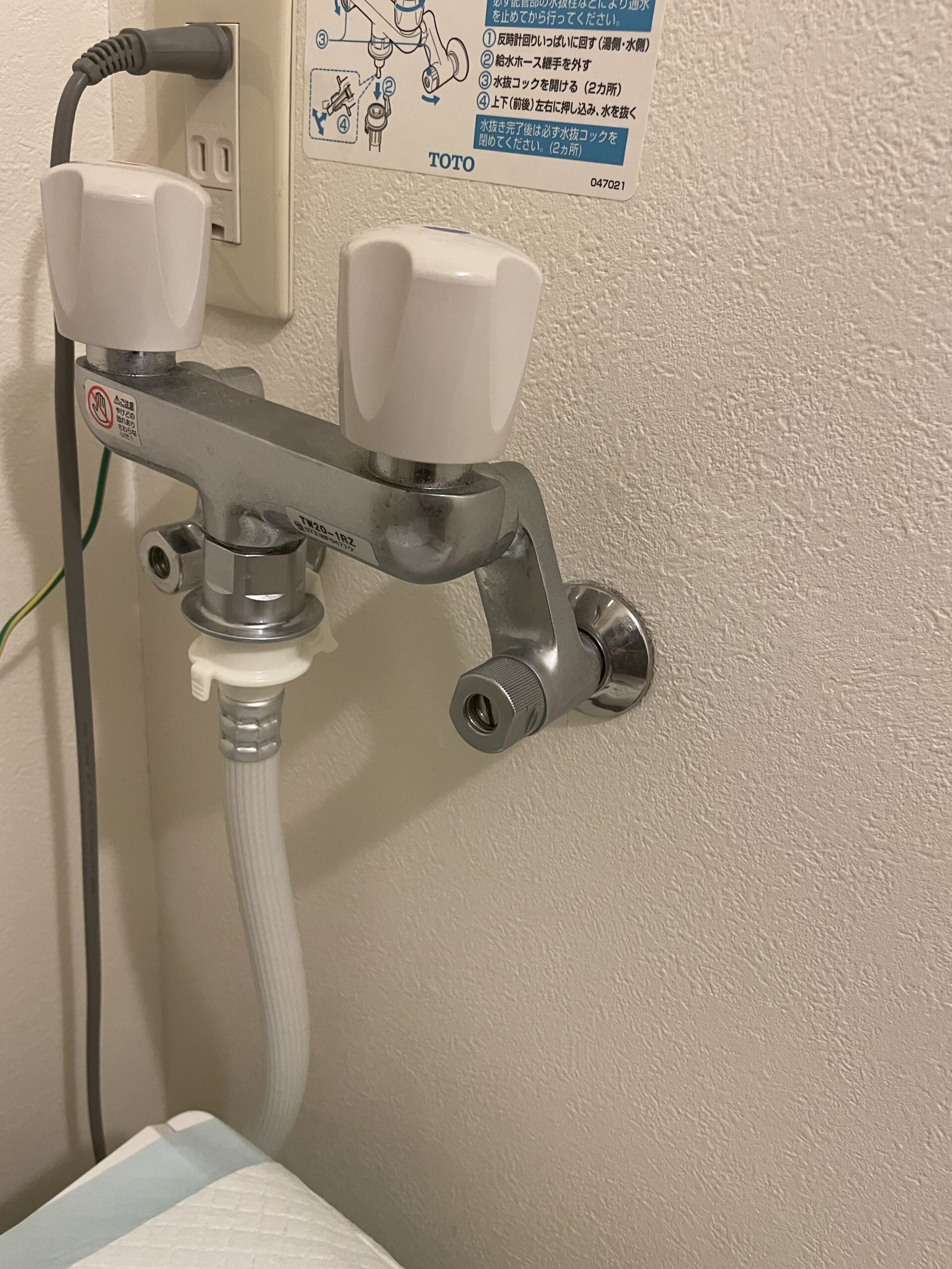 洗濯水栓水漏れ。増し締めで水漏れは止まっていますが再発するようでしたら部品もしくは本体廃盤品の為、本体交換が必要になると説明をしました