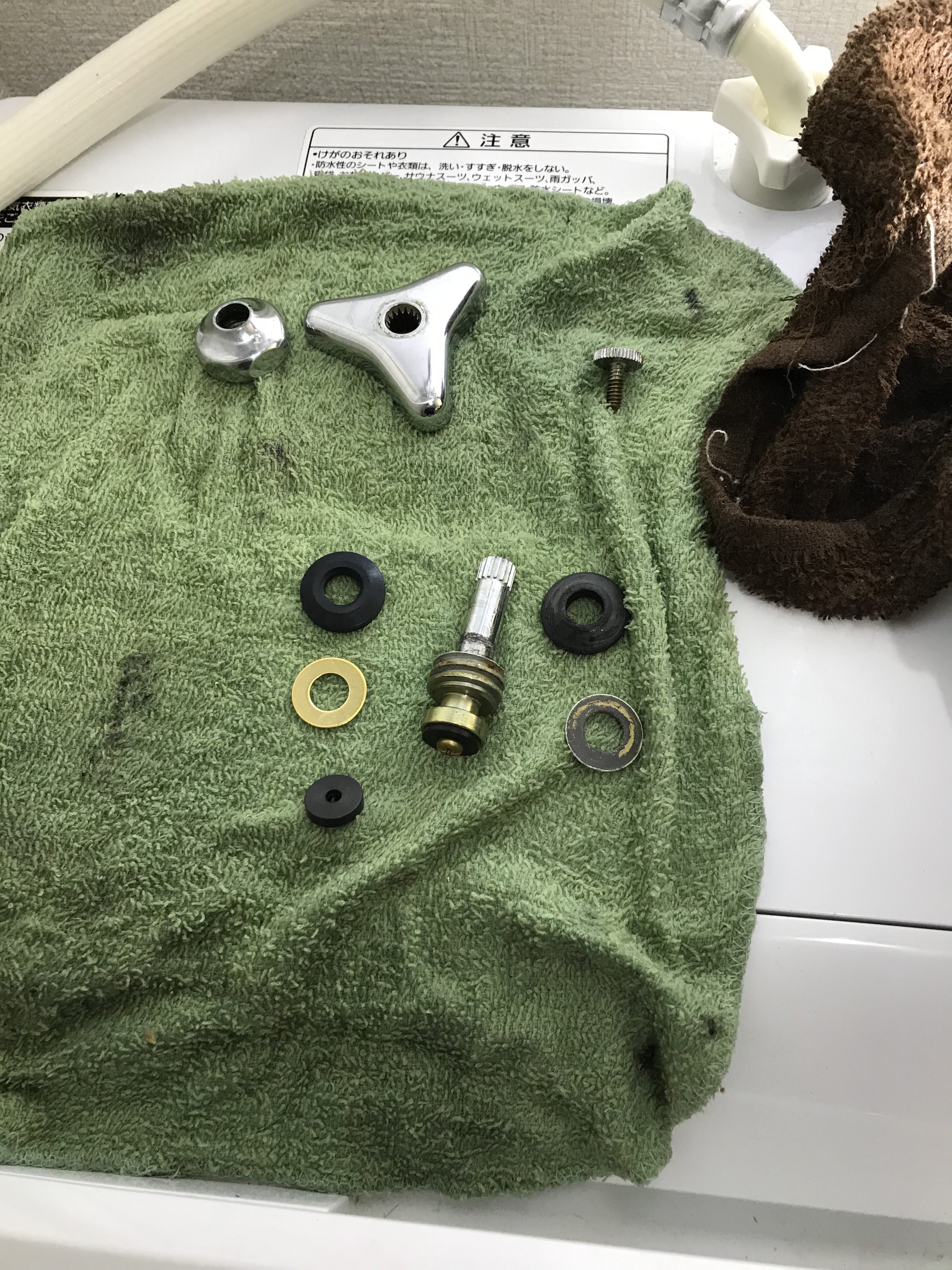 部品を解体し、ナット内にある三角パッキンを交換することで症状は改善しました。