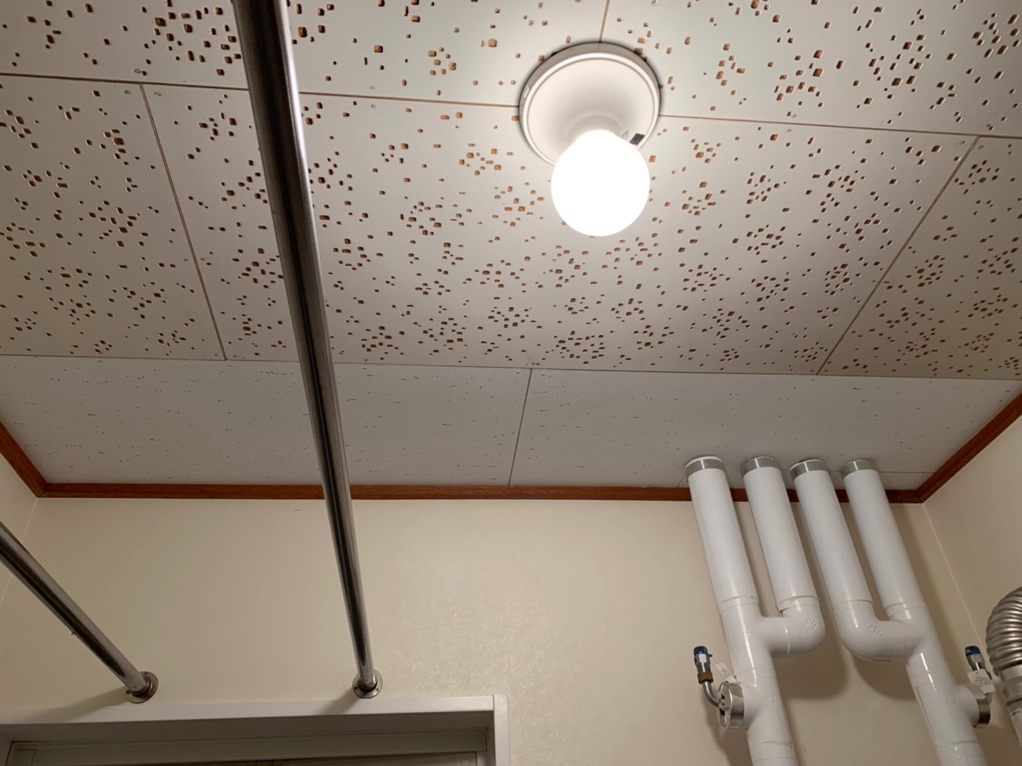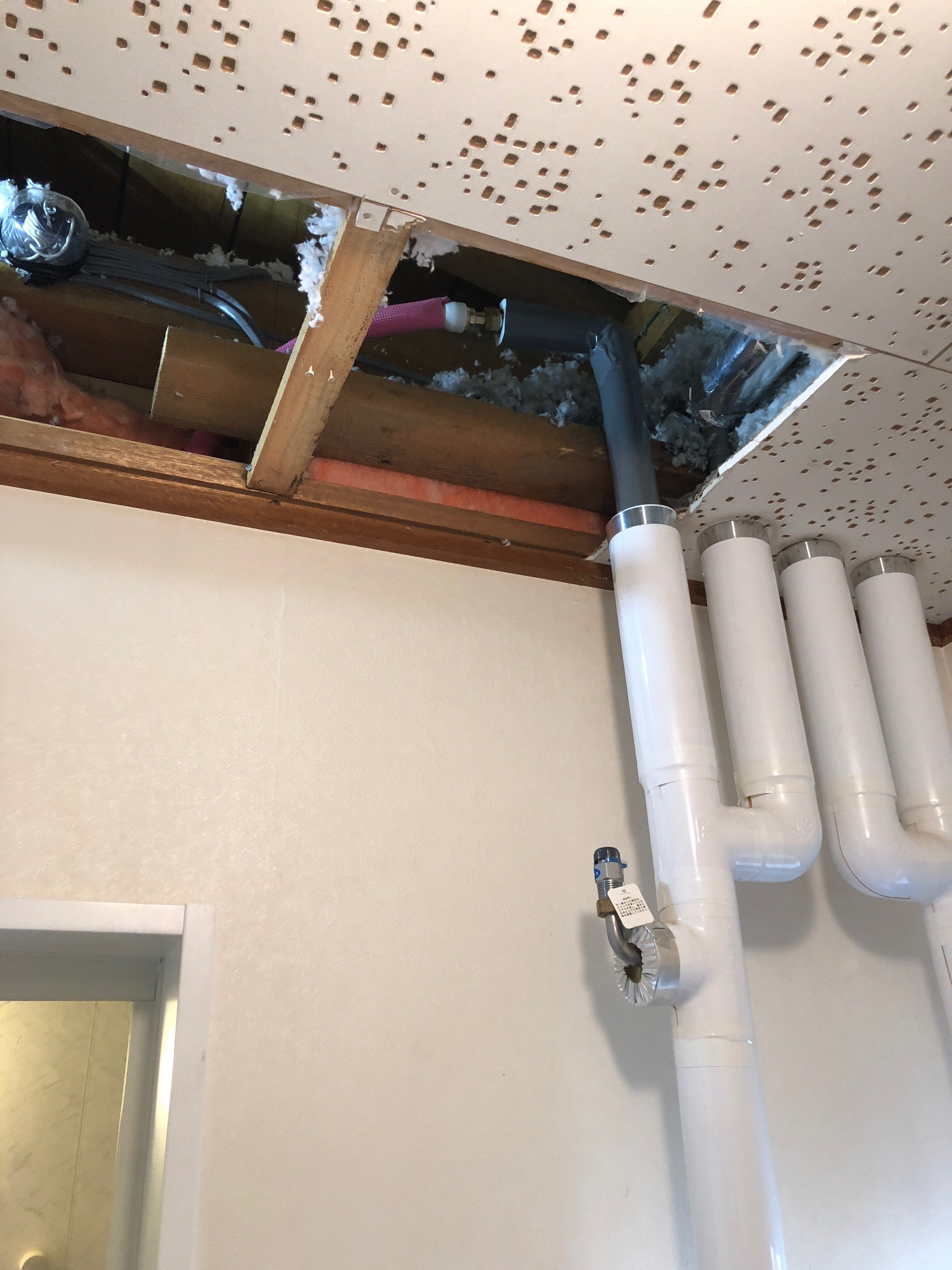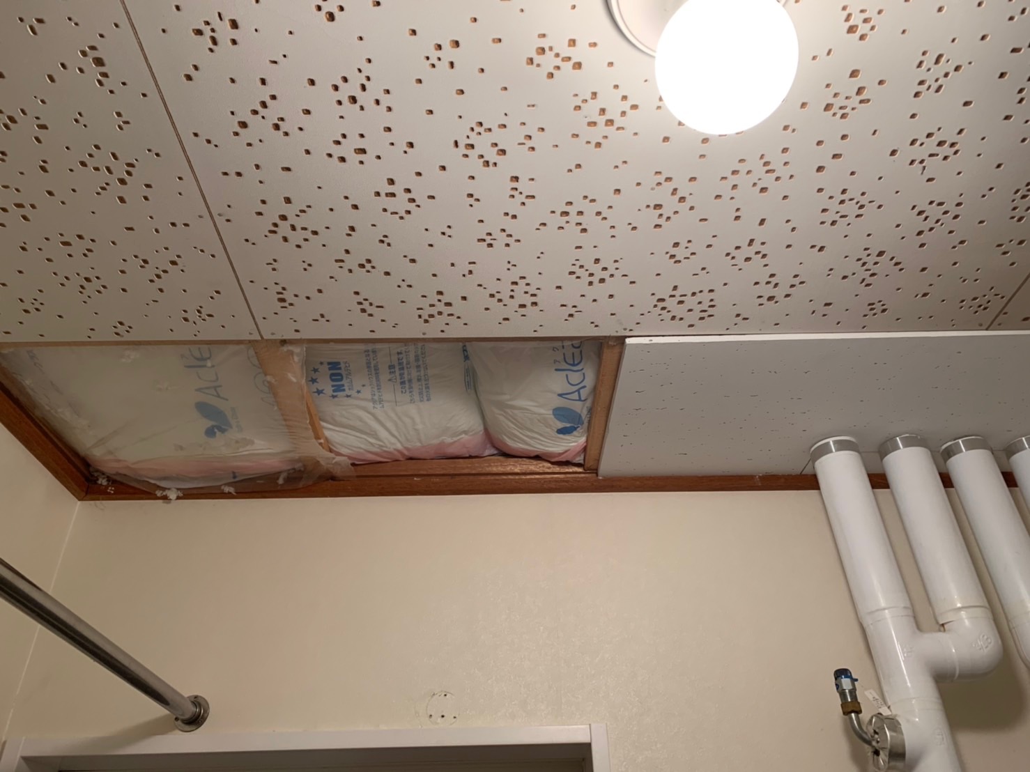 通水テストをして水漏れがないことを確認し、断熱材を天井に埋込んで、閉口作業を行いました。