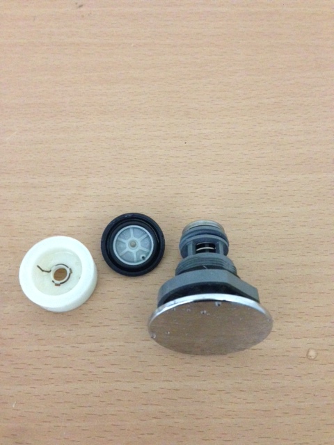 こちらの止水する機能の、ダイヤフラム部という部分とボタンである自閉バルブ部分を交換し解消されました。