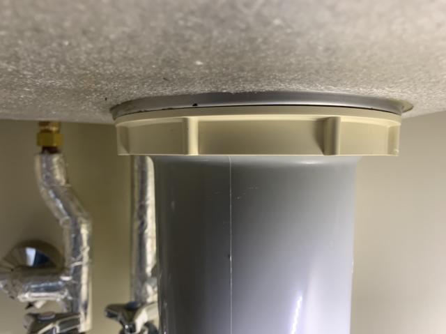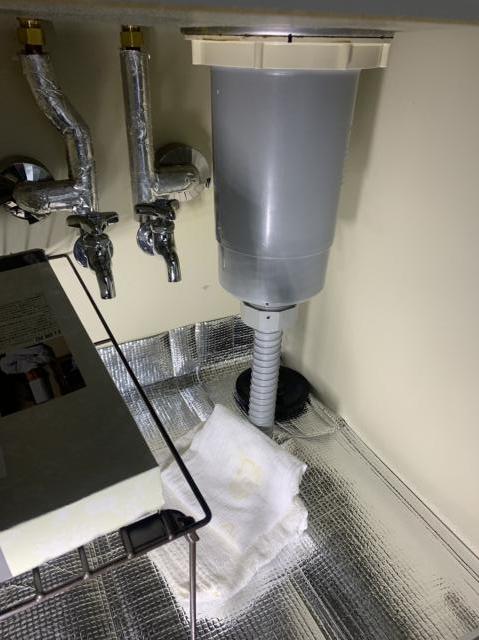 一旦排水トラップを外し、キッチンとの隙間を埋めるパッキンを交換して再度テストをし、漏れがないことを確認しました。