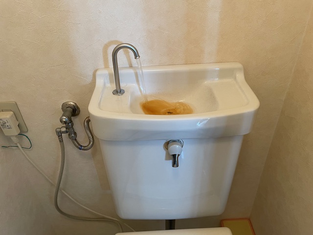 手洗い管が折れてしまい、タンクの中で接続管が水漏れした状態になっているとのご申告がありました。