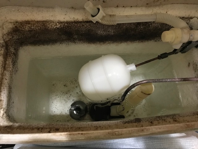 原因は、トイレのフロートゴムの上に置く鉄の節水器具が落下して、ゴムの下に挟まっていた模様です。