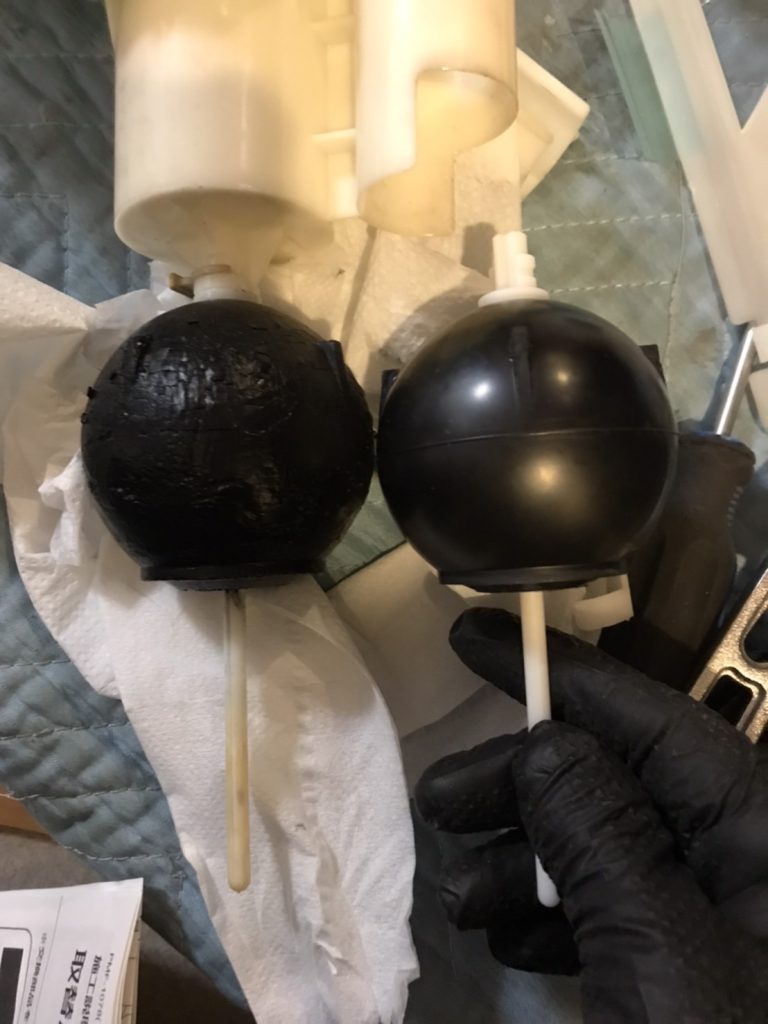 ゴム玉と呼ばれる部品が劣化に劣化を重ねて止水できる機能を失っており、こちらを交換して症状は改善しました。