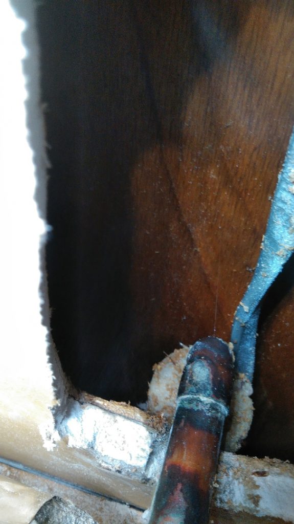 本日は何日か前からトイレの壁の中からポタポタと音がして床が濡れているので見て欲しいとの依頼で行ってきました。点検すると確かに壁内から音がしてます。恐らくお湯側の銅管のピンホールと思われます。築19年の一軒家で水側は鉄管でお湯側は全て銅管なので水漏れしてもおかしくない年数です。トイレの前の天井に点検口が付いていてそこからトイレ水漏れ付近のクロスボードを剥がしてみると銅管の曲がりの部分から糸状に水が漏れていました。そこの管を切って新しい管を圧着し改善しました。当社以外に何社にも見積もりを提示して貰ったがどこも高かったので、オタクに頼んで良かったと喜んでいました。お役に立てて良かったです。!(^^)!