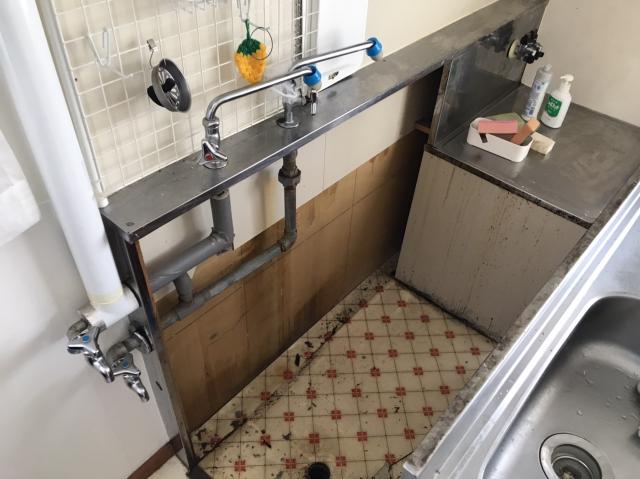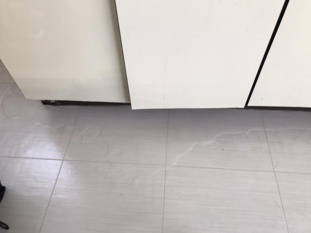 気が付いたらキッチンの床から水漏れしてきており、到着時には割と水たまりが出来ている状態でした。