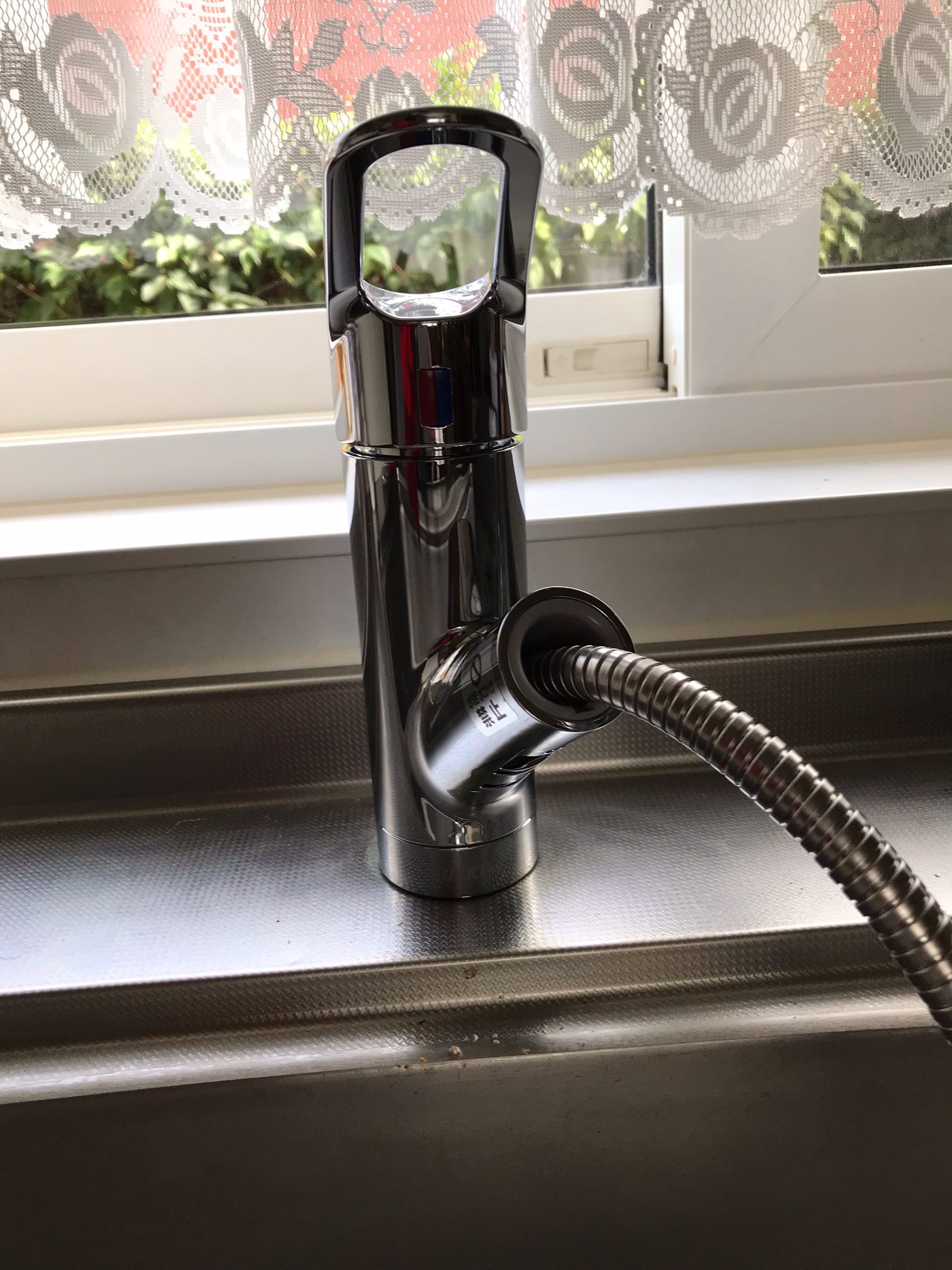 前々から引き出し式のものを使用したいと思っていたみたいで、持ち合わせていた水栓で本体交換を行いました。