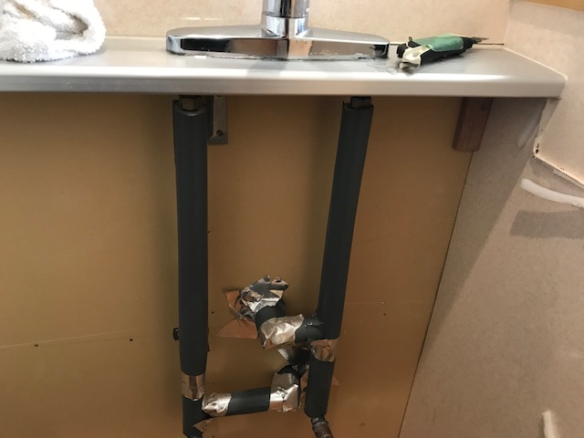 台所には点検口などがなかったので、シンクを一旦取り外して、蛇口の配管などがオープンな状態で施工しました。