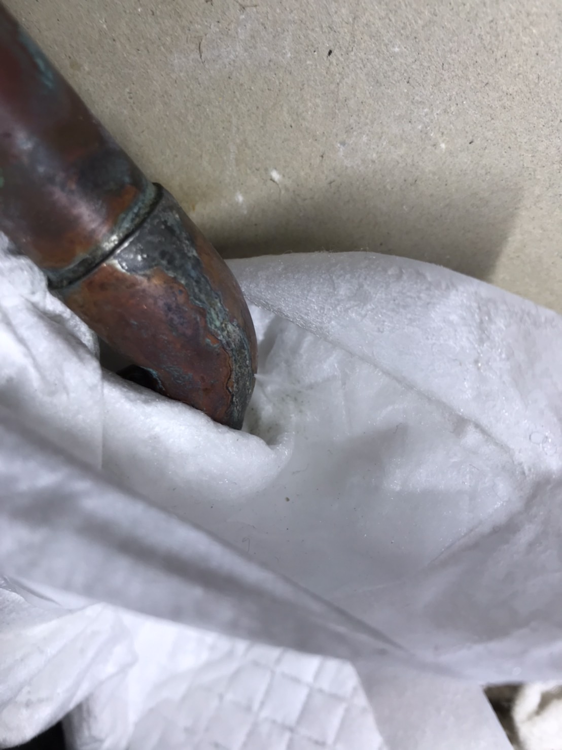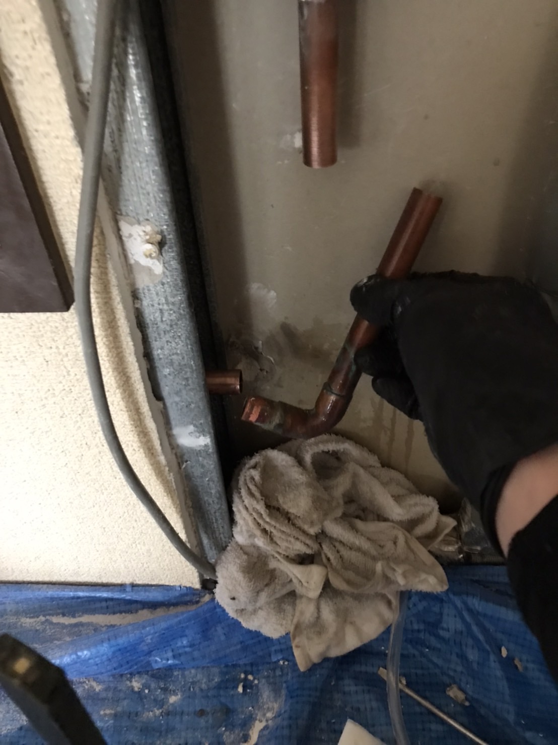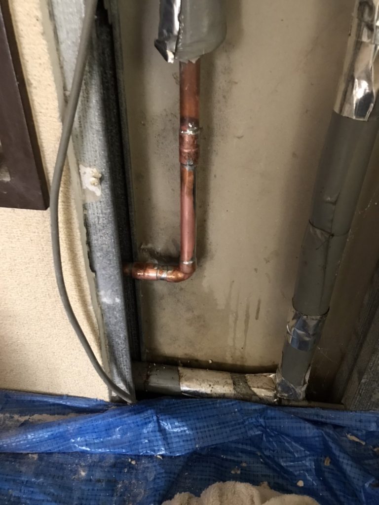 すると銅管の一部でピンホールしているのが見つかり、こちらを溶接作業にて修繕して症状は改善しました。