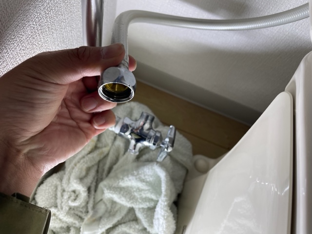 管理会社様経由で依頼を受け、トイレの給水ホースと止水栓の間から水漏れするとのことでした。